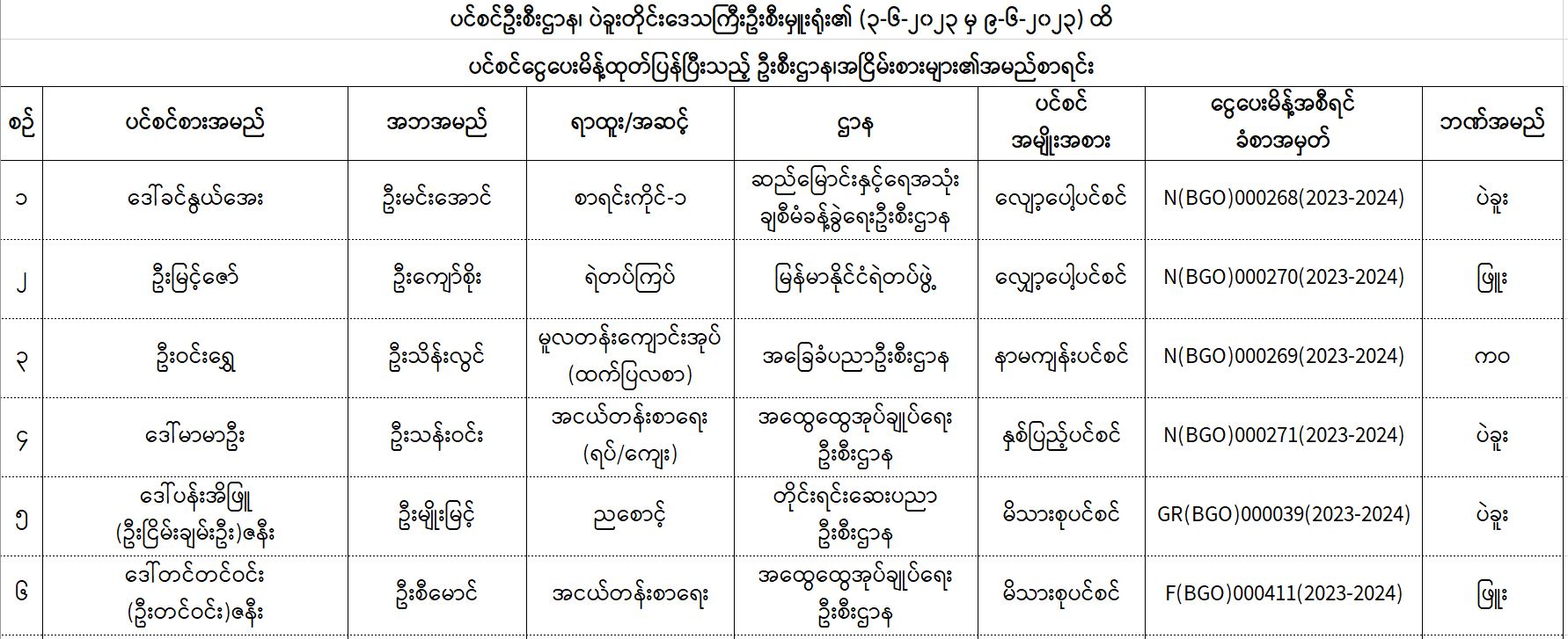 ပင်စင်ဦးစီးဌာန၊ ပဲခူးတိုင်းဒေသကြီးဦးစီးမှူးရုံး၏ ငွေပေးမိန့်ထုတ်ပြန်မှုစာရင်း (၃-၆-၂၀၂၃ မှ ၉-၆-၂၀၂၃) pension_editor Thu, 06/22/2023 - 11:46