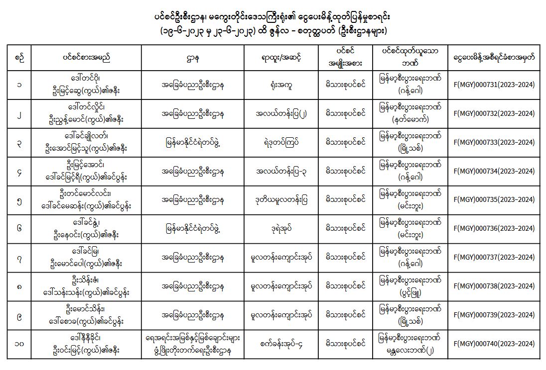 ပင်စင်ဦးစီးဌာန၊ မကွေးတိုင်းဒေသကြီးဦးစီးမှူးရုံး၏ ငွေပေးမိန့်ထုတ်ပြန်မှုစာရင်း (၁၉-၆-၂၀၂၃ မှ ၂၃-၆-၂၀၂၃) pension_editor Thu, 06/22/2023 - 14:14