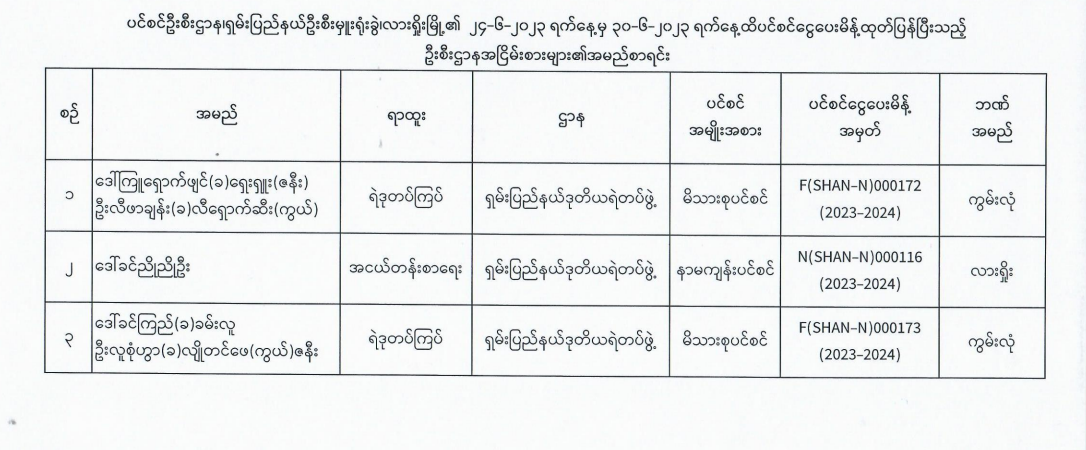 ပင်စင်ဦးစီးဌာန၊ ရှမ်းပြည်နယ်ရုံးခွဲ(လားရှိုးမြို့)၏ ငွေပေးမိန့်ထုတ်ပြန်မှုစာရင်း (၂၄-၆-၂၀၂၃ မှ ၃၀-၆-၂၀၂၃) pension_editor Fri, 06/30/2023 - 16:39
