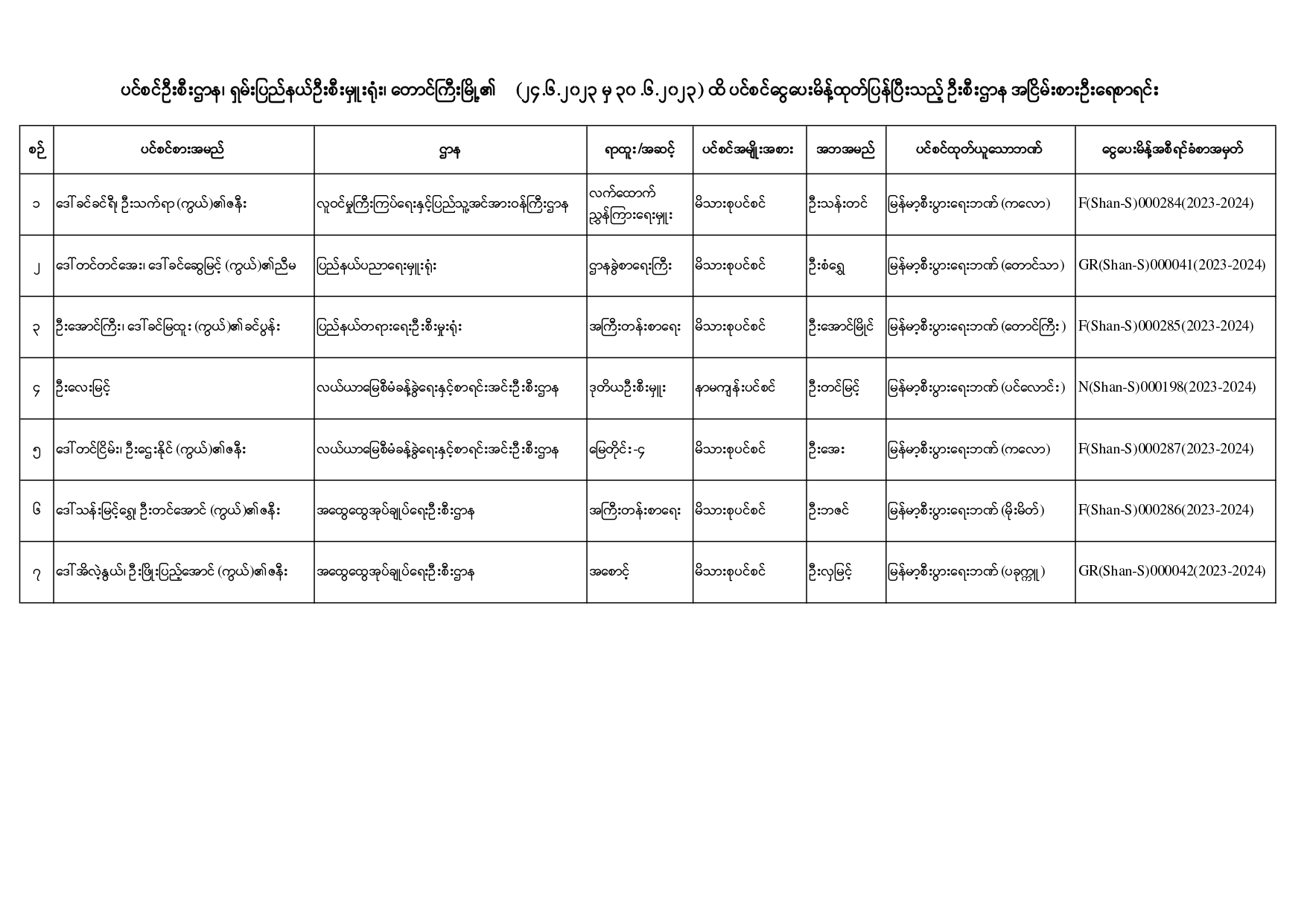 ပင်စင်ဦးစီးဌာန၊ ရှမ်းပြည်နယ်ဦးစီးမှူးရုံး၏ ငွေပေးမိန့်ထုတ်ပြန်မှုစာရင်း (၂၄-၆-၂၀၂၃ မှ ၃၀-၆-၂၀၂၃)