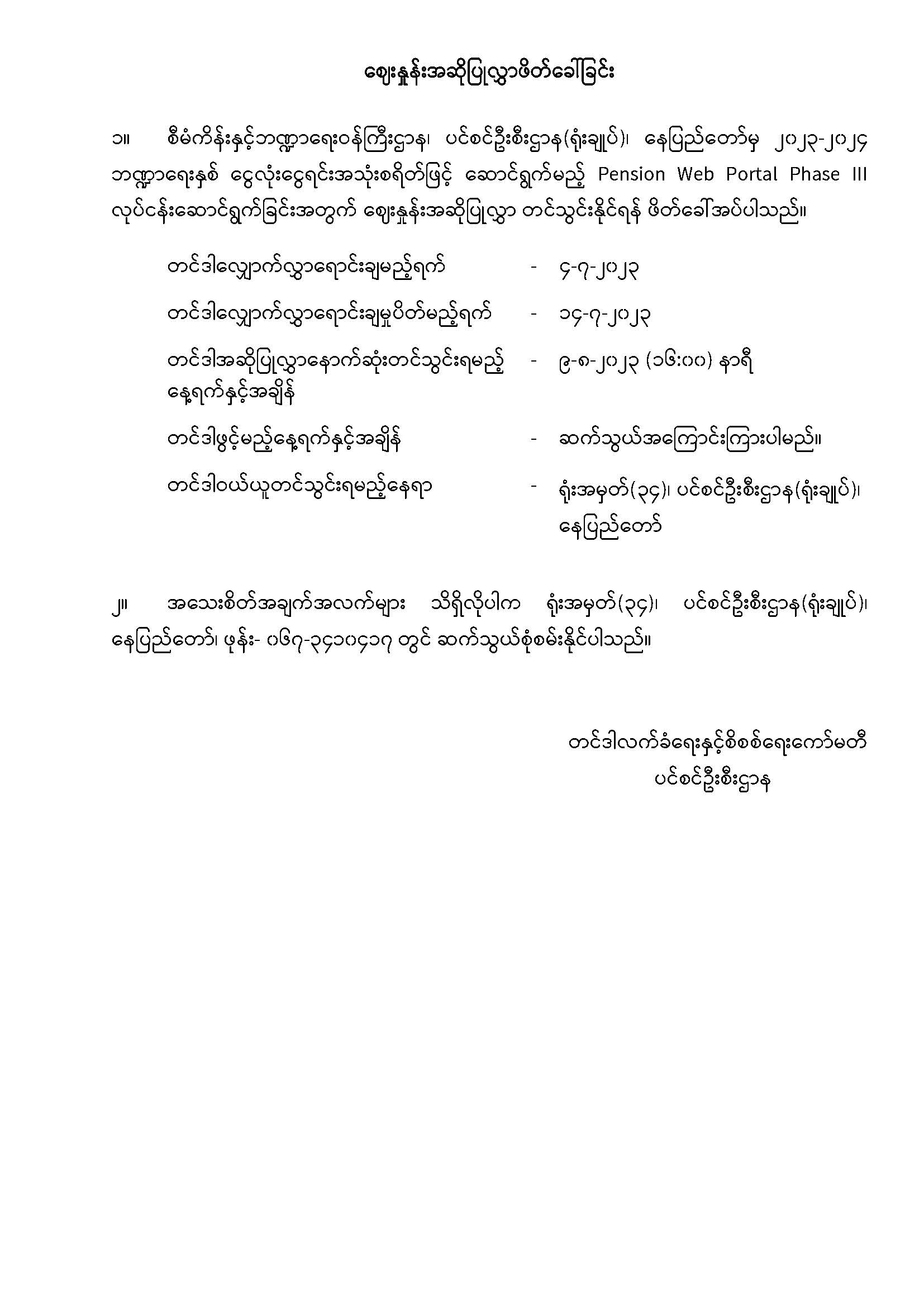 Pension Web Portal Phase III လုပ်ငန်းဆောင်ရွက်ရန်အတွက် အိတ်ဖွင့်တင်ဒါခေါ်ယူခြင်း pension_editor Tue, 07/04/2023 - 11:33