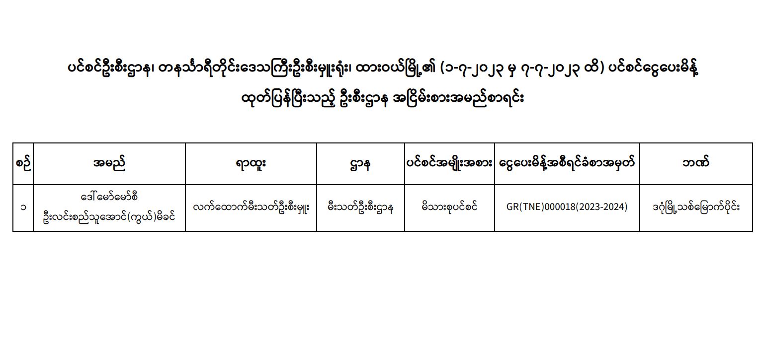 ပင်စင်ဦးစီးဌာန၊ တနင်္သာရီတိုင်းဒေသကြီးဦးစီးမှူးရုံး၏ ငွေပေးမိန့်ထုတ်ပြန်မှုစာရင်း (၁-၇-၂၀၂၃ မှ ၇-၇-၂၀၂၃)