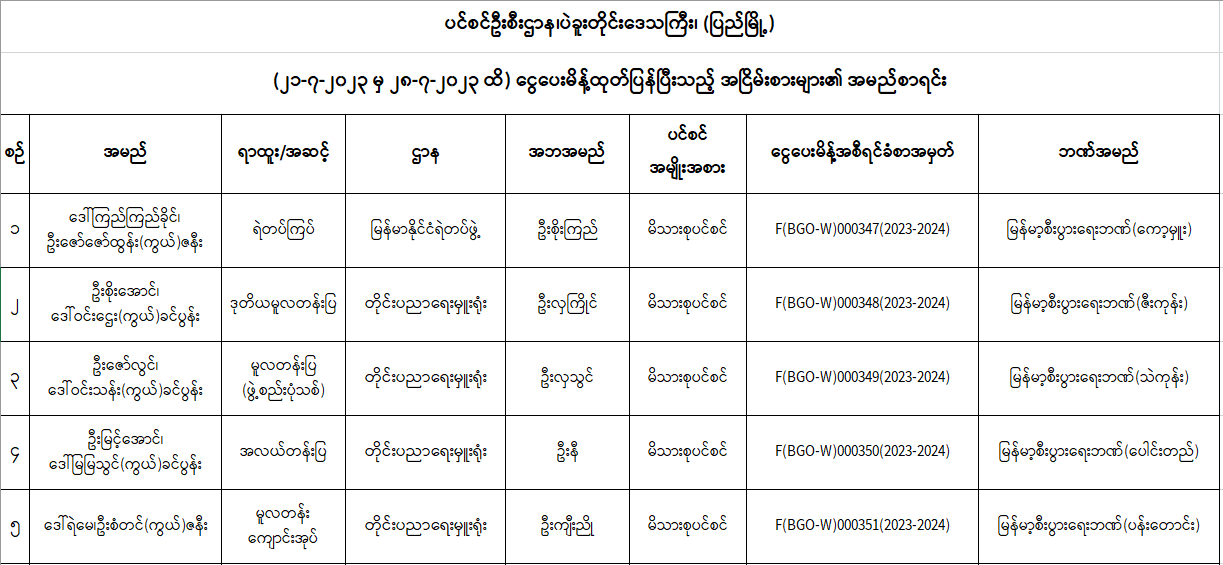 ပင်စင်ဦးစီးဌာန၊ ပဲခူးတိုင်းဒေသကြီးရုံးခွဲ(ပြည်မြို့)၏ ငွေပေးမိန့်ထုတ်ပြန်မှုစာရင်း (၂၁-၇-၂၀၂၃ မှ ၂၈-၇-၂၀၂၃) pension_editor Fri, 07/28/2023 - 11:12