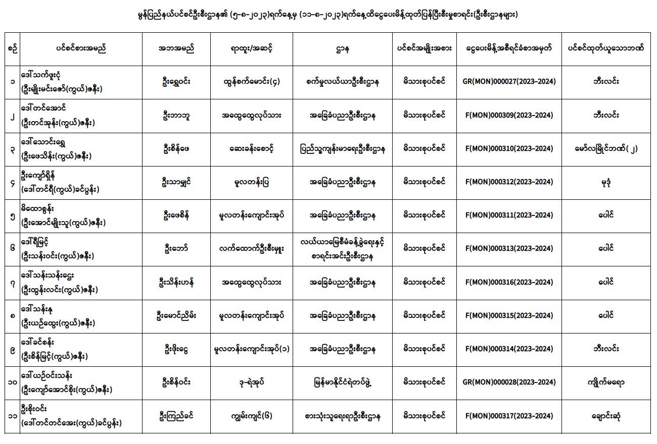 ပင်စင်ဦးစီးဌာန၊ မွန်ပြည်နယ်ဦးစီးမှူးရုံး၏ ငွေပေးမိန့်ထုတ်ပြန်မှုစာရင်း (၅-၈-၂၀၂၃ မှ ၁၁-၈-၂၀၂၃)