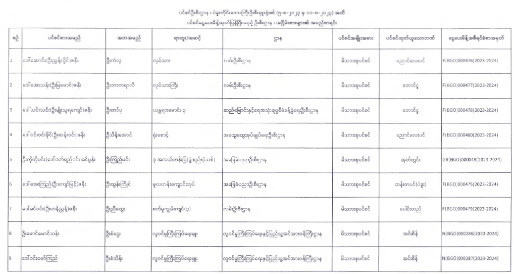 ပင်စင်ဦးစီးဌာန၊ ပဲခူးတိုင်းဒေသကြီးဦးစီးမှူးရုံး၏ ငွေပေးမိန့်ထုတ်ပြန်မှုစာရင်း (၅-၈-၂၀၂၃ မှ ၁၁-၈-၂၀၂၃)