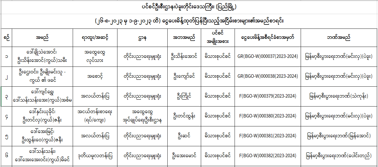 ပင်စင်ဦးစီးဌာန၊ ပဲခူးတိုင်းရုံးခွဲ(ပြည်မြို့)၏ ငွေပေးမိန့်ထုတ်ပြန်မှုစာရင်း (၂၆-၈-၂၀၂၃ မှ ၁-၉-၂၀၂၃) pension_editor Mon, 09/04/2023 - 13:38