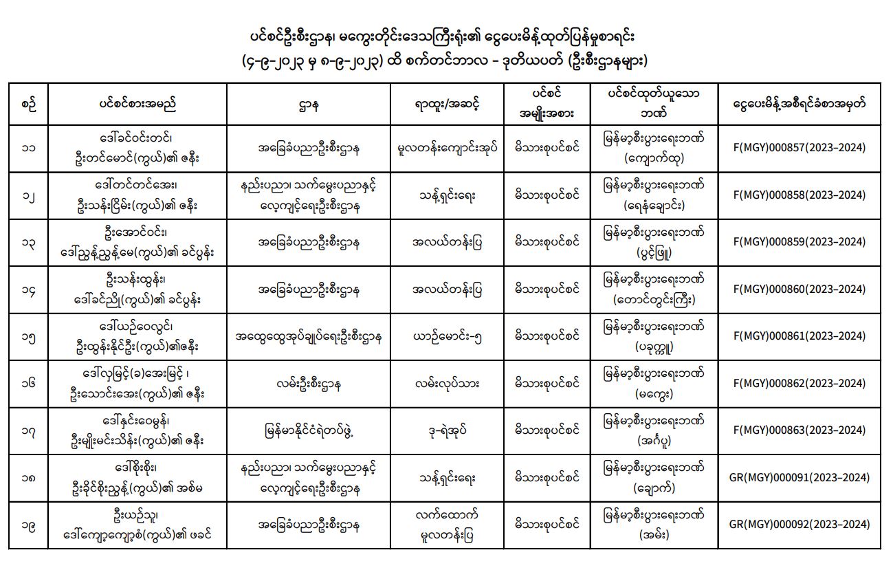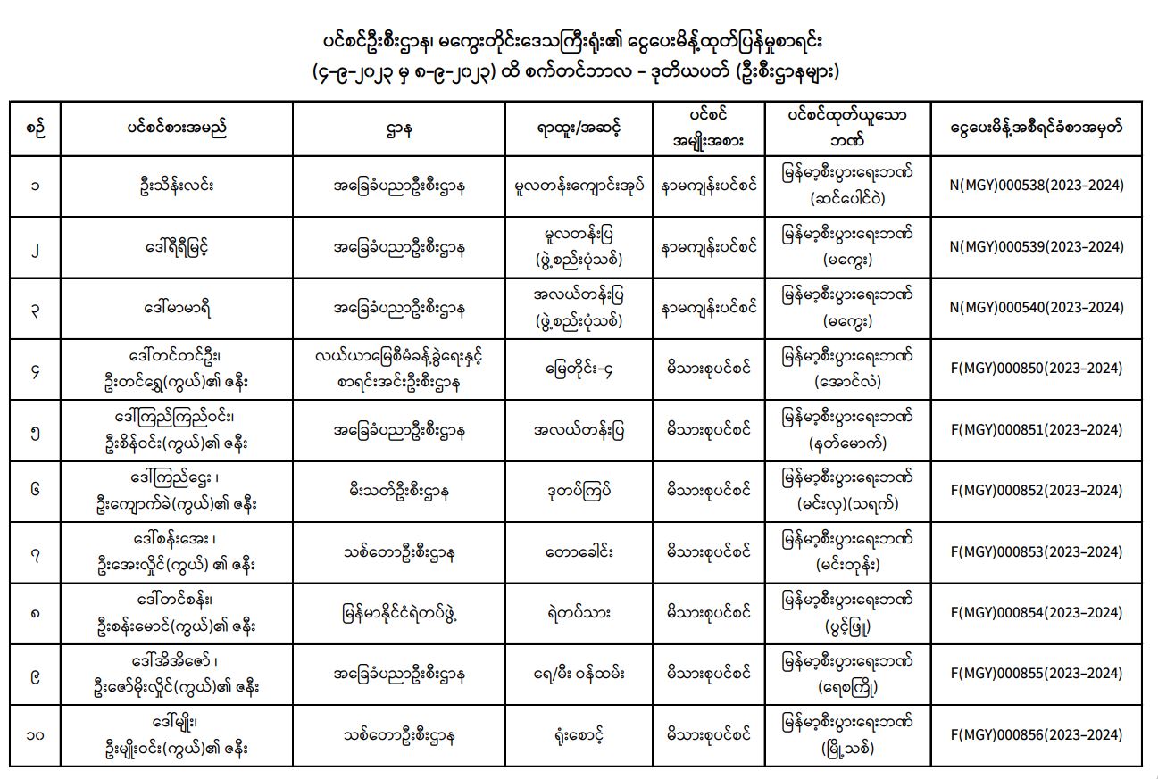 ပင်စင်ဦးစီးဌာန၊ မကွေးတိုင်းဒေသကြီးဦးစီးမှူးရုံး၏ ငွေပေးမိန့်ထုတ်ပြန်မှုစာရင်း (၄-၉-၂၀၂၃ မှ ၈-၉-၂၀၂၃) pension_editor Thu, 09/07/2023 - 15:13