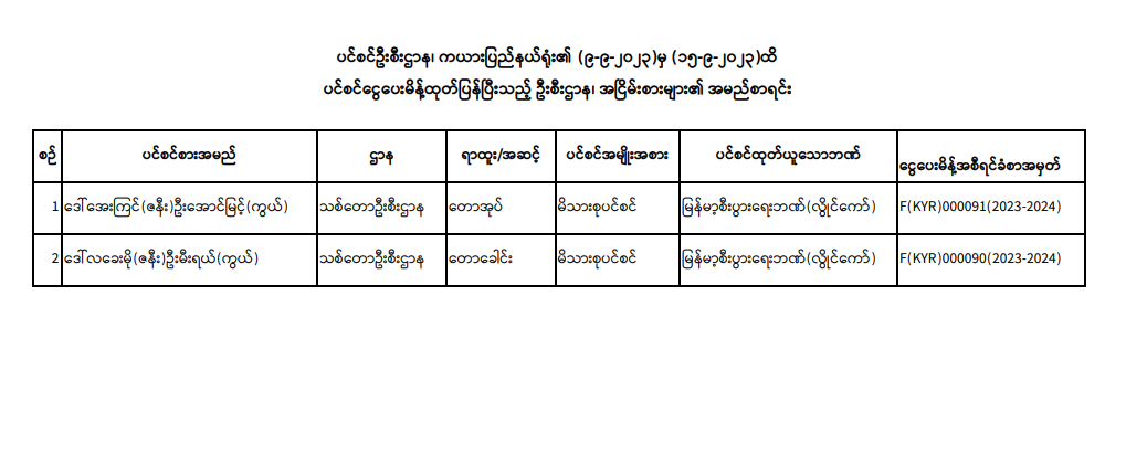 ပင်စင်ဦးစီးဌာန၊ ကယားပြည်နယ်ဦးစီးမှူးရုံး၏ ငွေပေးမိန့်ထုတ်ပြန်မှုစာရင်း ( ၉-၉-၂၀၂၃ မှ ၁၅-၉-၂၀၂၃ ထိ) pension_editor Mon, 09/18/2023 - 16:13