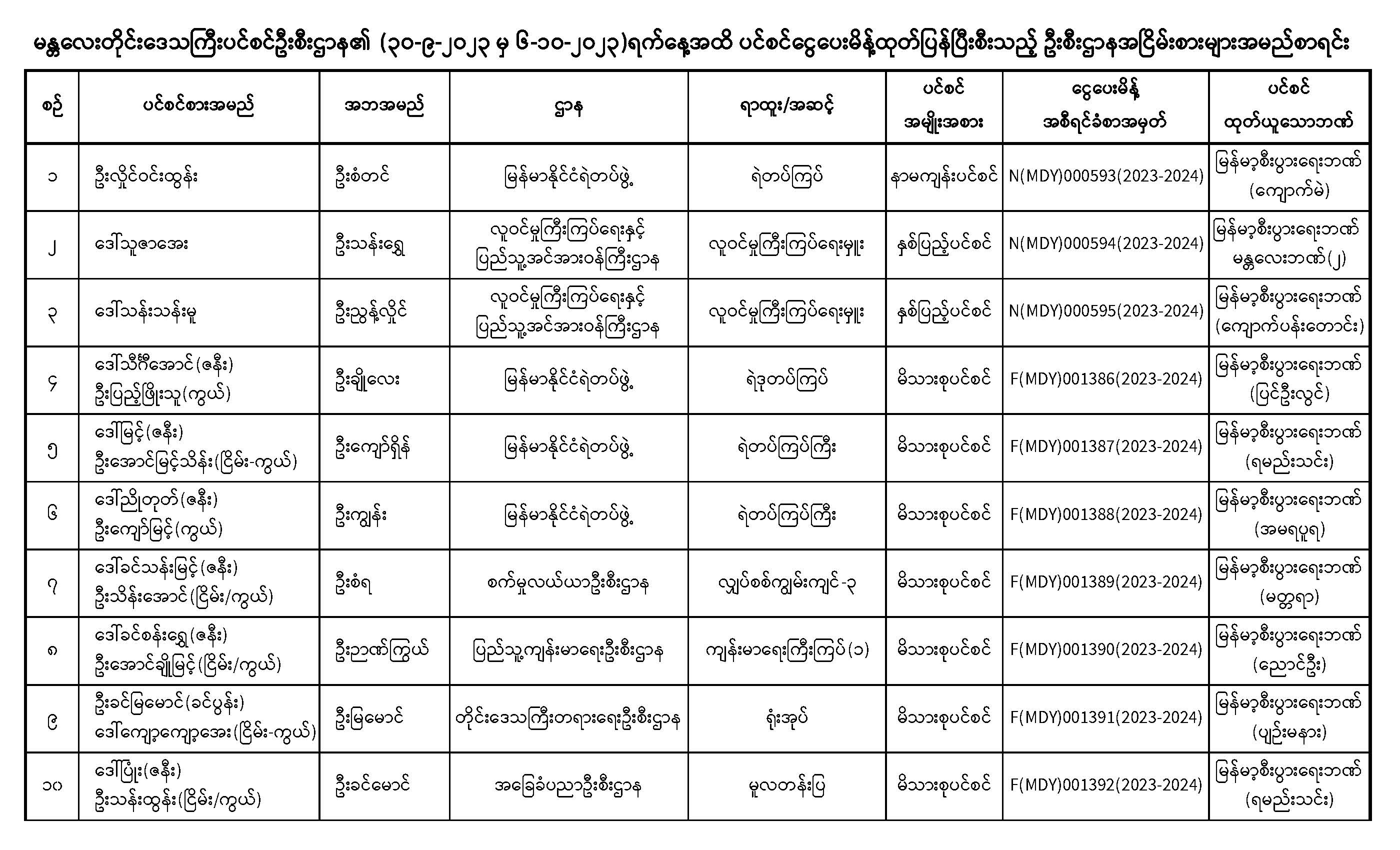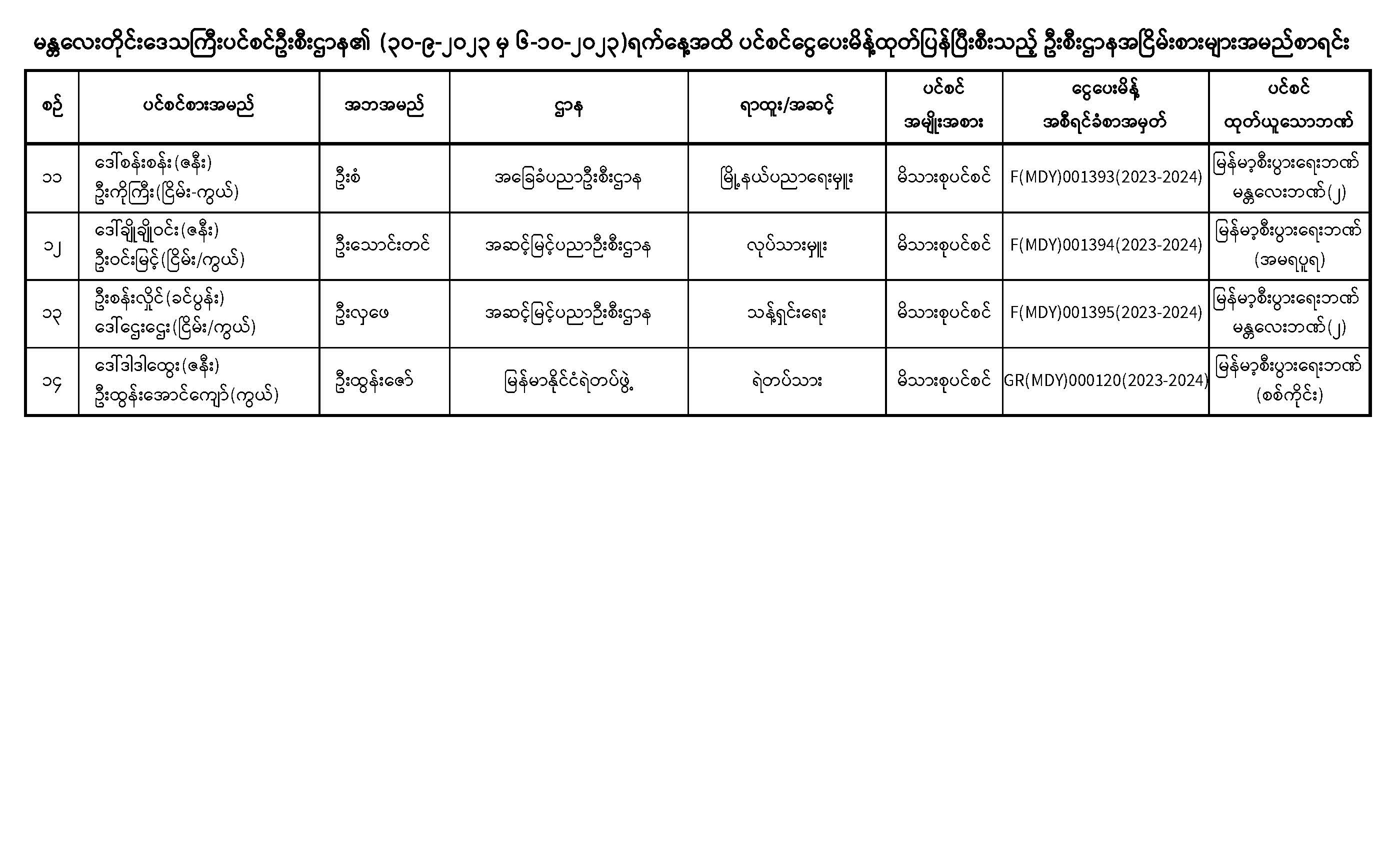 ပင်စင်ဦးစီးဌာန၊ မန္တလေးတိုင်းဒေသကြီးဦးစီးမှူးရုံး၏ ငွေပေးမိန့်ထုတ်ပြန်မှုစာရင်း (၃၀-၉-၂၀၂၃ မှ ၆-၁၀-၂၀၂၃) pension_editor Tue, 10/10/2023 - 12:55