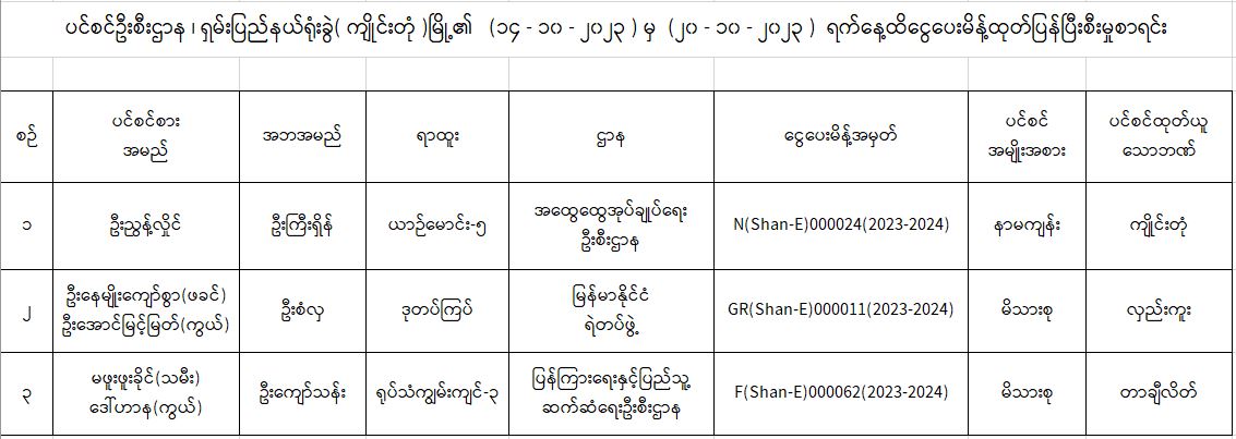 ပင်စင်ဦးစီးဌာန၊ ရှမ်းပြည်နယ်ရုံးခွဲ(ကျိုင်းတုံမြို့)၏ ငွေပေးမိန့်ထုတ်ပြန်မှုစာရင်း (၁၄-၁၀-၂၀၂၃ မှ ၂၀-၁၀-၂၀၂၃)