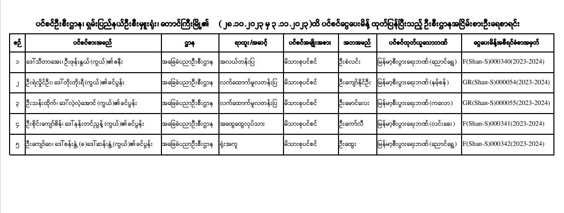 ပင်စင်ဦးစီးဌာန၊ ရှမ်းပြည်နယ်ဦးစီးမှူးရုံး၏ ငွေပေးမိန့်ထုတ်ပြန်မှုစာရင်း (၂၈-၁၀-၂၀၂၃ မှ ၃-၁၁-၂၀၂၃) pension_editor Mon, 11/06/2023 - 15:44