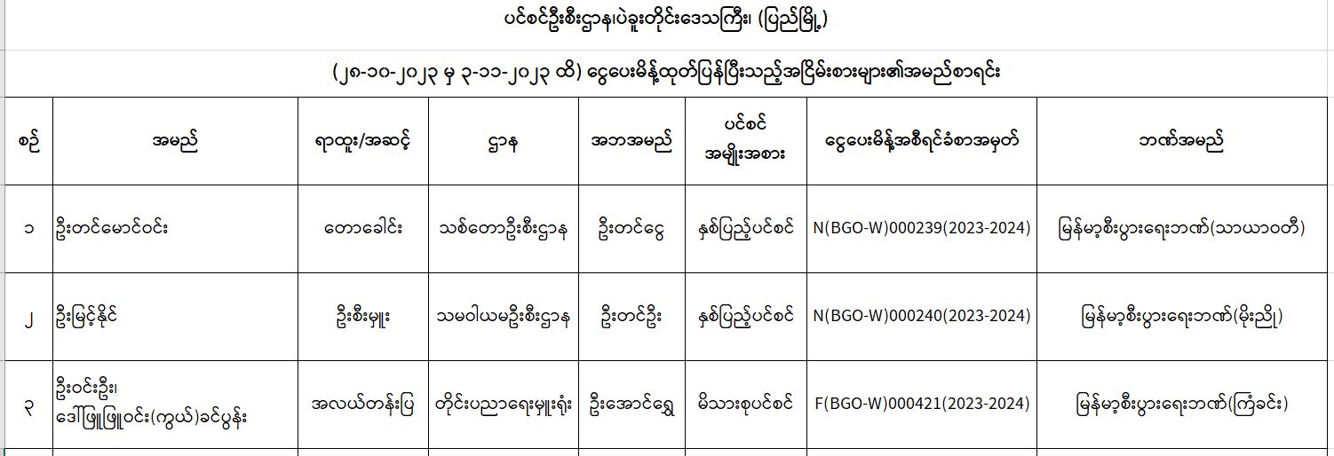 ပင်စင်ဦးစီးဌာန၊ ပဲခူးတိုင်းရုံးခွဲ(ပြည်မြို့)၏ ငွေပေးမိန့်ထုတ်ပြန်မှုစာရင်း (၂၈-၁၀-၂၀၂၃ မှ ၃-၁၁-၂၀၂၃) pension_editor Mon, 11/06/2023 - 16:04