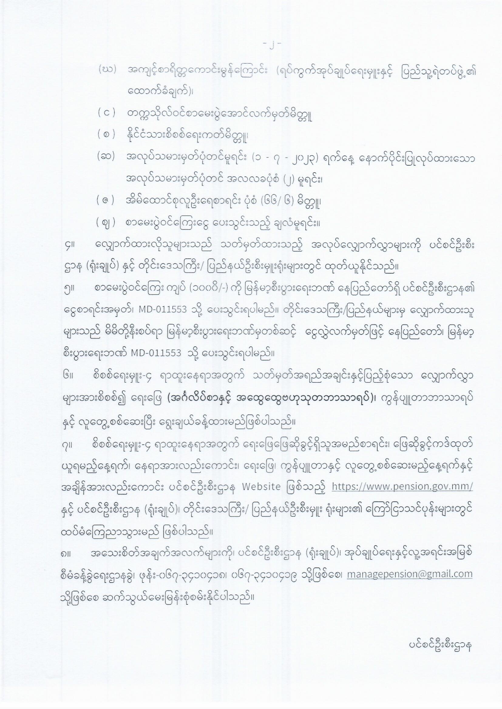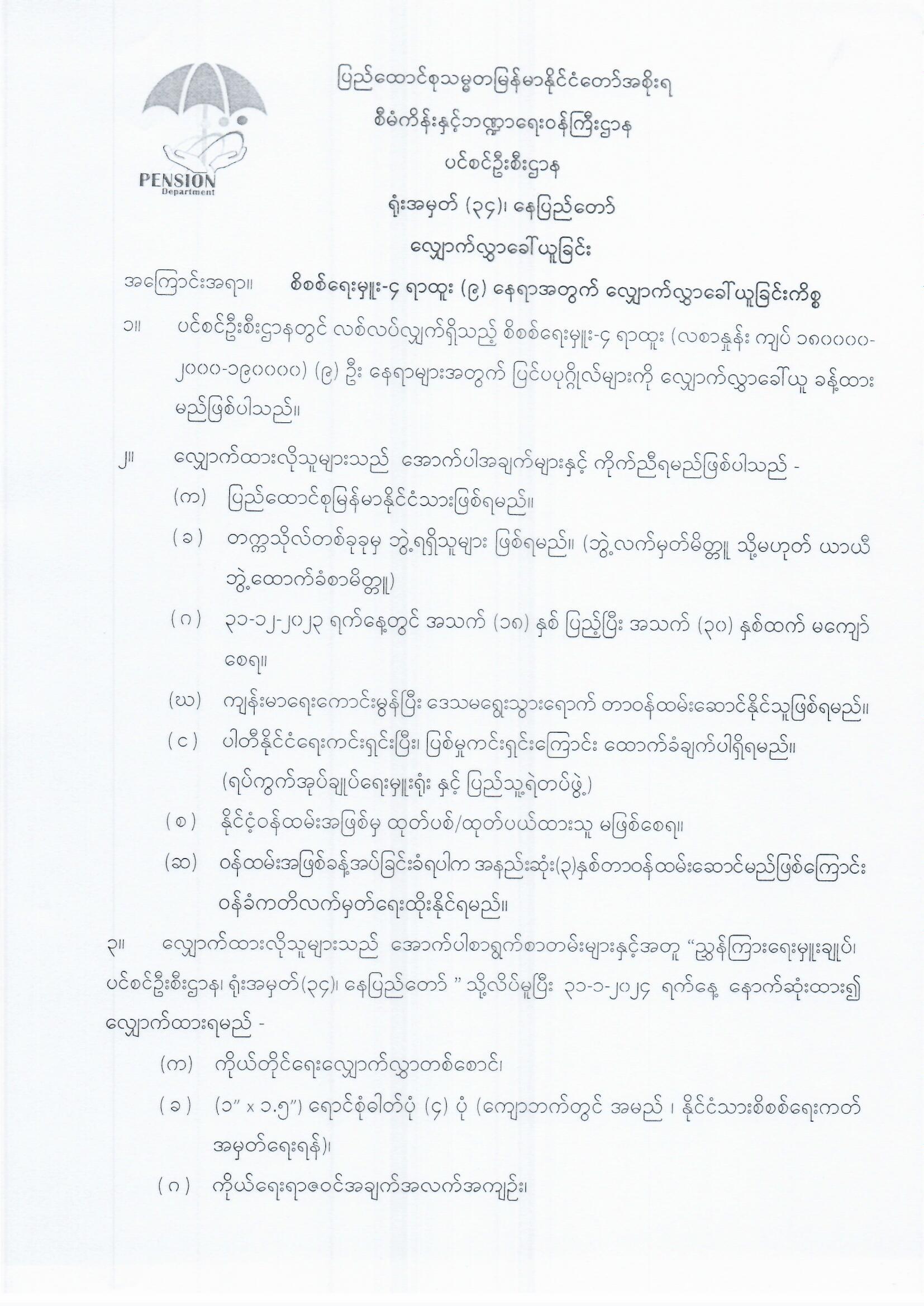 ပင်စင်ဦးစီးဌာနမှ စိစစ်ရေးမှူး(၄)ရာထူး (၉) နေရာအတွက် လျှောက်လွှာခေါ်ယူခြင်း