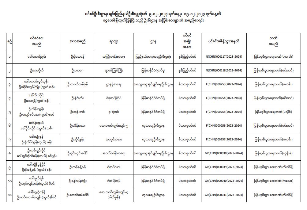 ပင်စင်ဦးစီးဌာန၊ ချင်းပြည်နယ်ဦးစီးမှူးရုံး၏ ငွေပေးမိန့်ထုတ်ပြန်မှုစာရင်း (၉-၁၂-၂၀၂၃ မှ ၁၅-၁၂-၂၀၂၃) pension_editor Wed, 12/20/2023 - 10:45