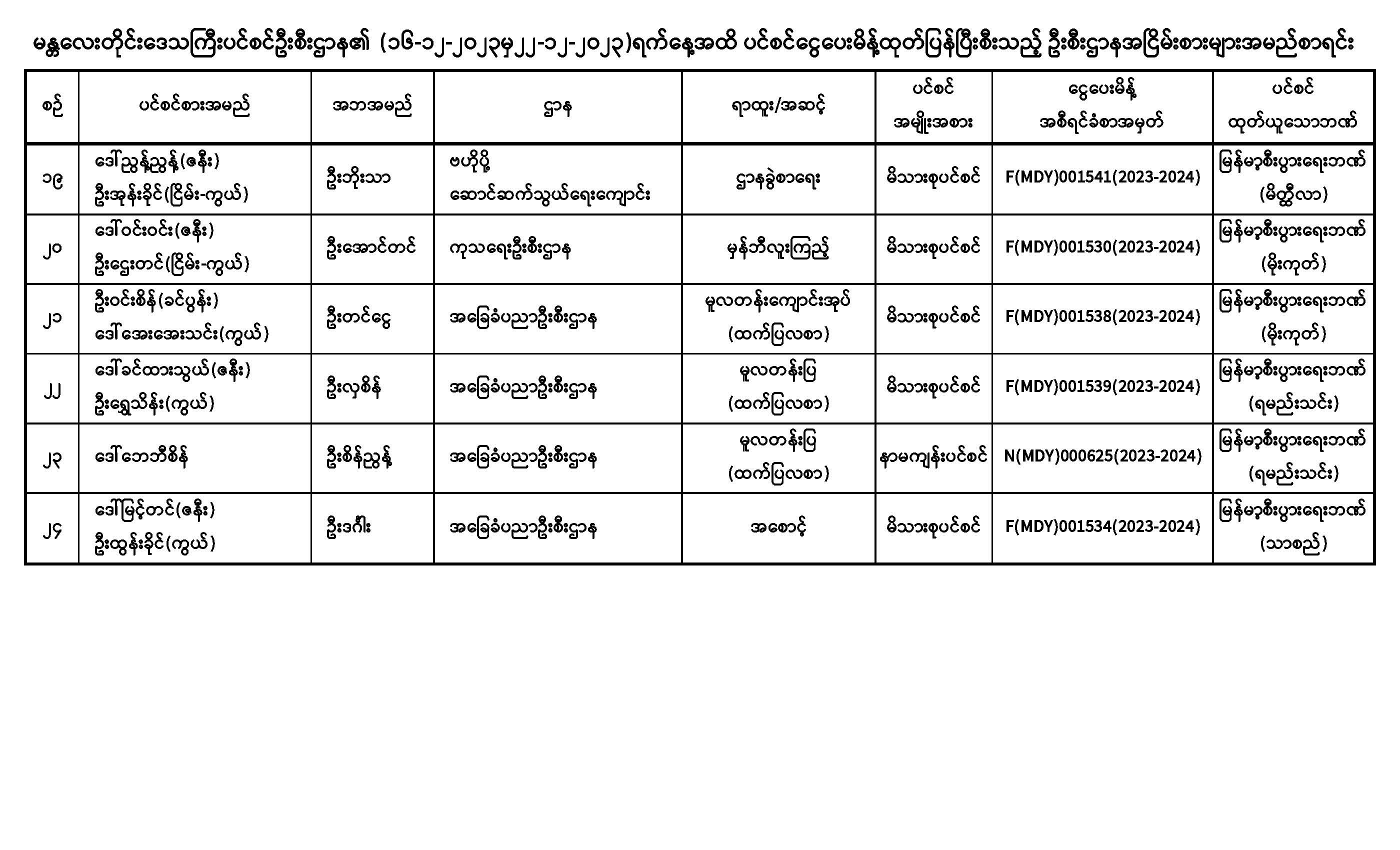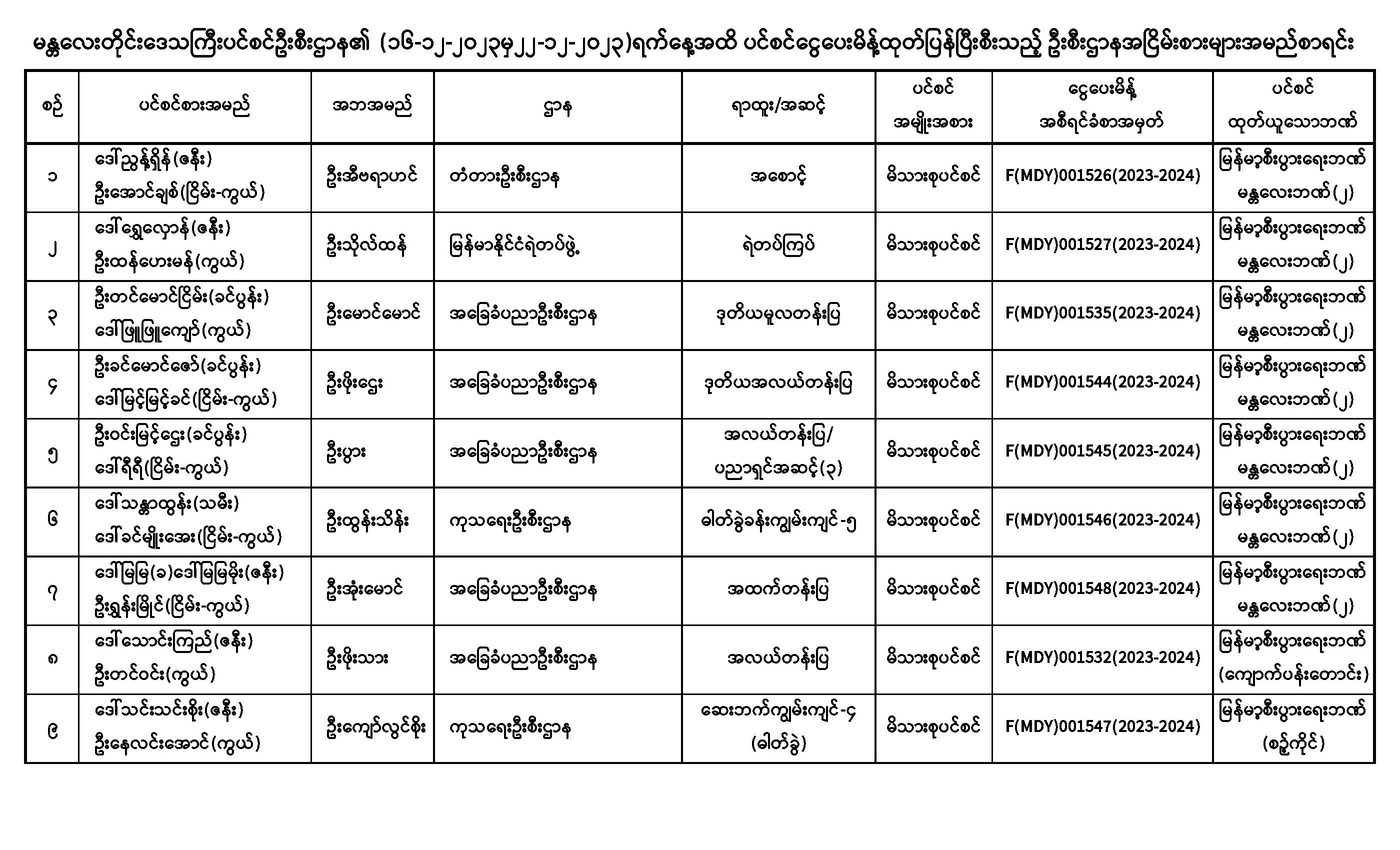 ပင်စင်ဦးစီးဌာန၊ မန္တလေးတိုင်းဒေသကြီးဦးစီးမှူးရုံး၏ ငွေပေးမိန့်ထုတ်ပြန်မှုစာရင်း (၁၆-၁၂-၂၀၂၃ မှ ၂၂-၁၂-၂၀၂၃) pension_editor Fri, 12/22/2023 - 11:17