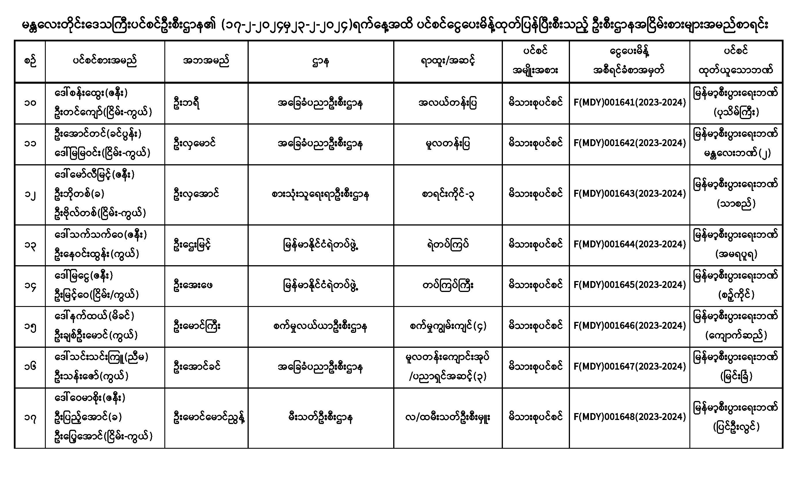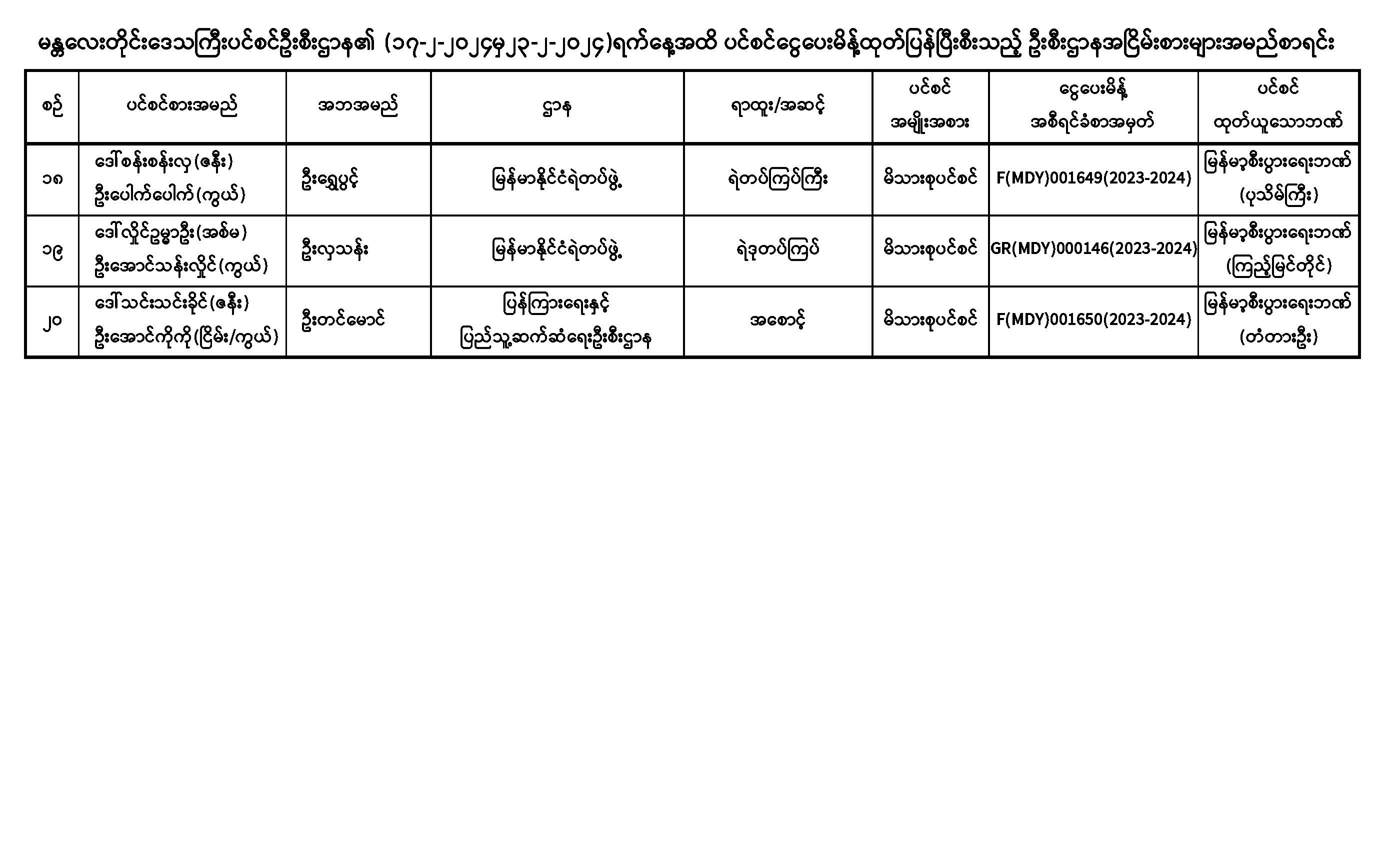 ပင်စင်ဦးစီးဌာန၊ မန္တလေးတိုင်းဒေသကြီးဦးစီးမှူးရုံး၏ ငွေပေးမိန့်ထုတ်ပြန်မှုစာရင်း (၁၇-၂-၂၀၂၄ မှ ၂၃-၂-၂၀၂၄)