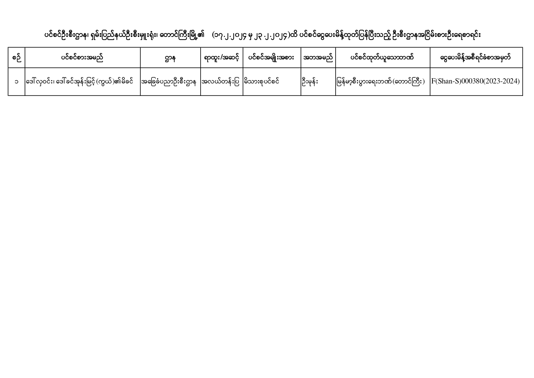 ပင်စင်ဦးစီးဌာန၊ ရှမ်းပြည်နယ်ဦးစီးမှူးရုံး၏ ငွေပေးမိန့်ထုတ်ပြန်မှုစာရင်း (၁၇-၂-၂၀၂၄ မှ ၂၃-၂-၂၀၂၄) pension_editor Tue, 02/27/2024 - 10:10