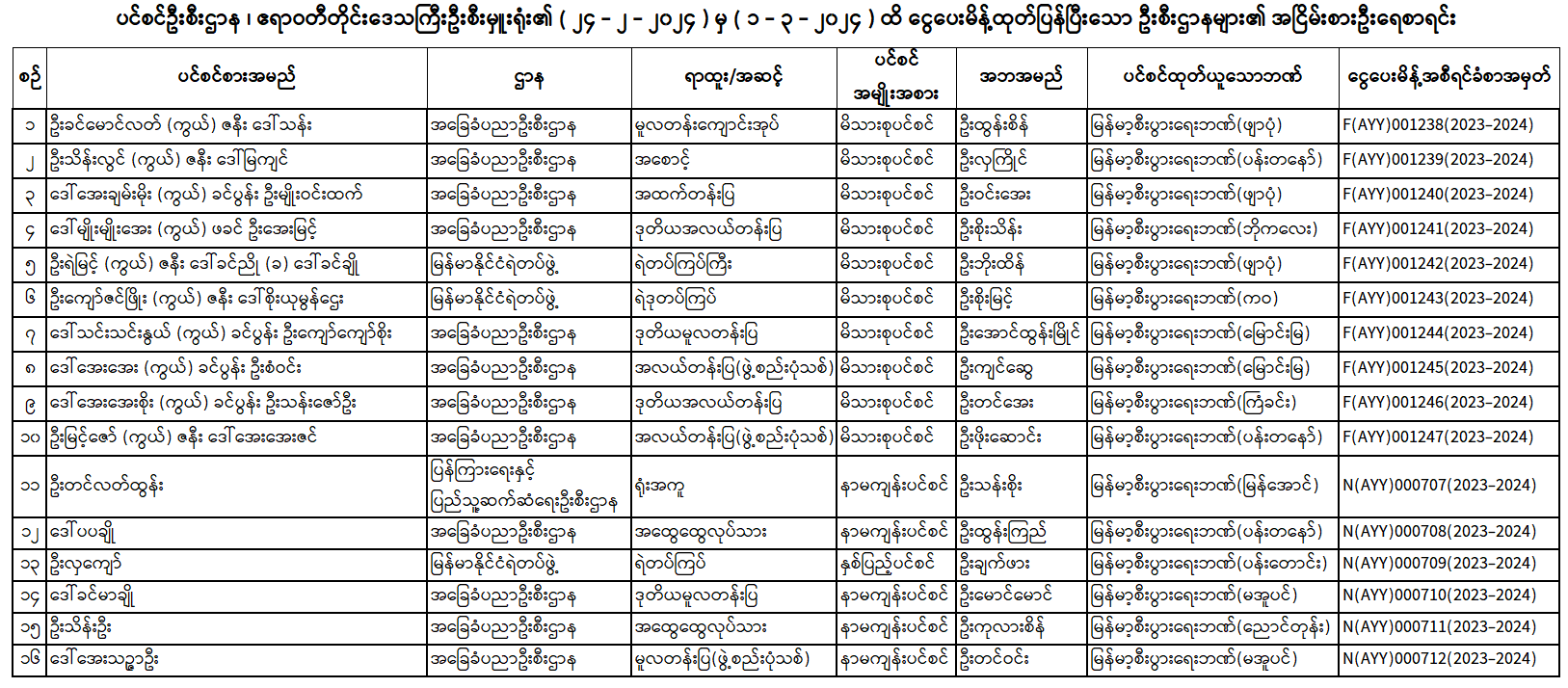 ပင်စင်ဦးစီးဌာန၊ ဧရာဝတီတိုင်းဒေသကြီးဦးစီးမှူးရုံး၏ ငွေပေးမိန့်ထုတ်ပြန်မှုစာရင်း (၂၄-၂-၂၀၂၄ မှ ၁-၃-၂၀၂၄)