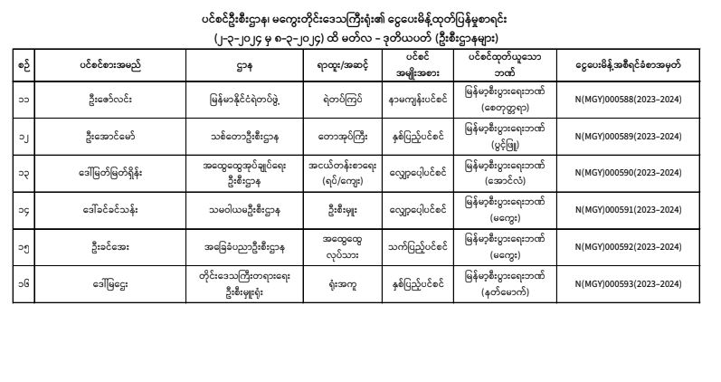 ပင်စင်ဦးစီးဌာန၊ မကွေးတိုင်းဒေသကြီးဦးစီးမှူးရုံး၏ ငွေပေးမိန့်ထုတ်ပြန်မှုစာရင်း (၂-၃-၂၀၂၄ မှ ၈-၃-၂၀၂၄) pension_editor Fri, 03/08/2024 - 10:22