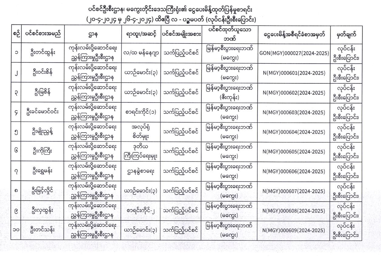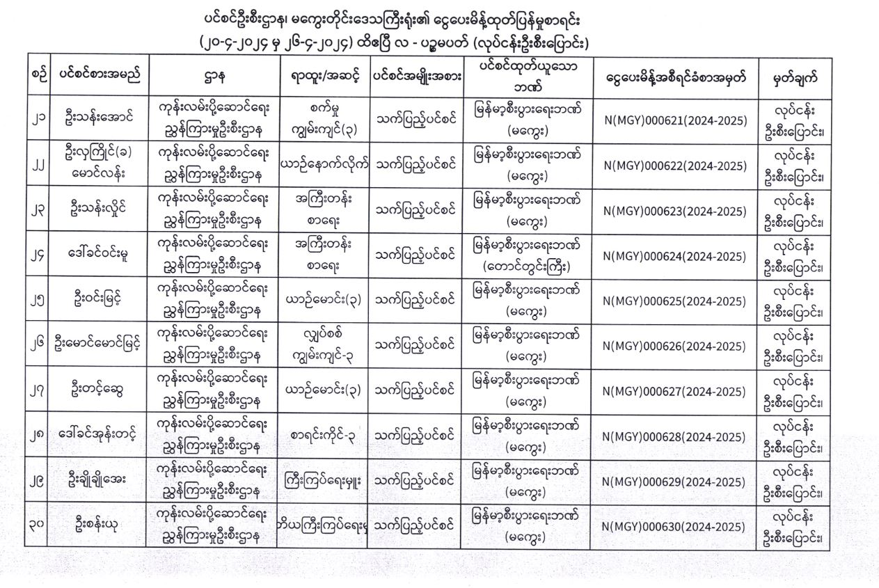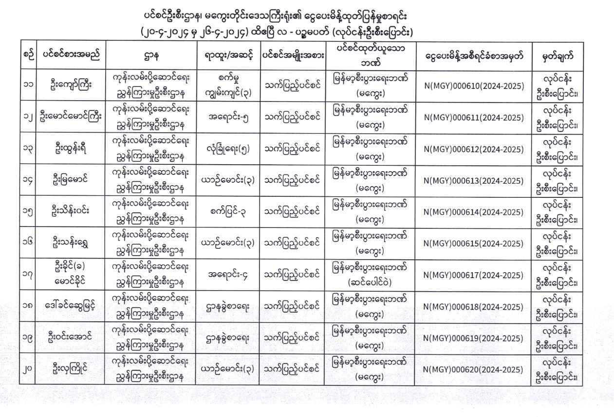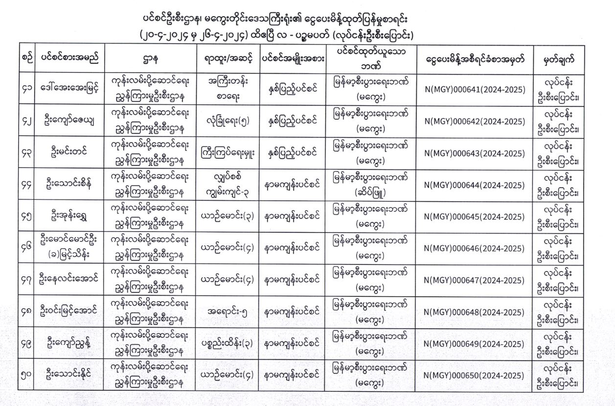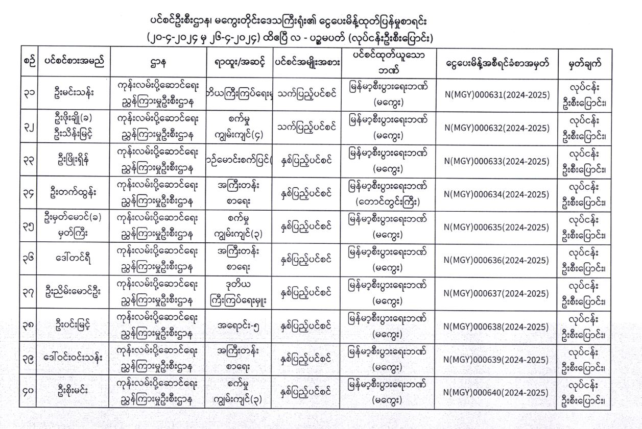 ပင်စင်ဦးစီးဌာန၊ မကွေးတိုင်းဒေသကြီးဦးစီးမှူးရုံး၏ လုပ်ငန်းမှ ဦးစီးပြောင်း ငွေပေးမိန့်ထုတ်ပြန်မှုစာရင်း (၂၀-၄-၂၀၂၄ မှ ၂၆--၄-၂၀၂၄) pension_editor Fri, 04/26/2024 - 16:29