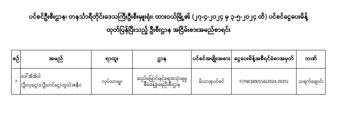 ပင်စင်ဦးစီးဌာန၊ တနင်္သာရီတိုင်းဒေသကြီးဦးစီးမှူးရုံး၏ ငွေပေးမိန့်ထုတ်ပြန်မှုစာရင်း (၂၇-၄-၂၀၂၄ မှ ၃-၅-၂၀၂၄) pension_editor Fri, 05/03/2024 - 15:42