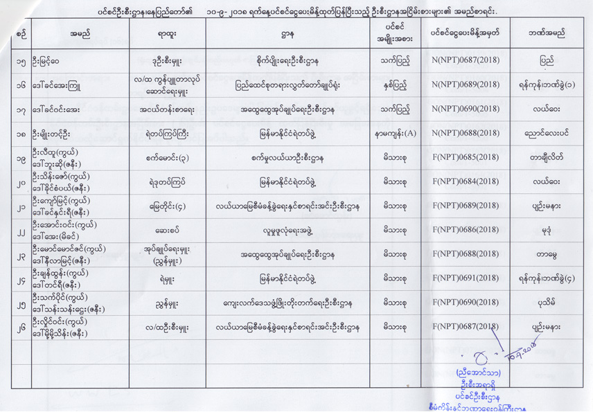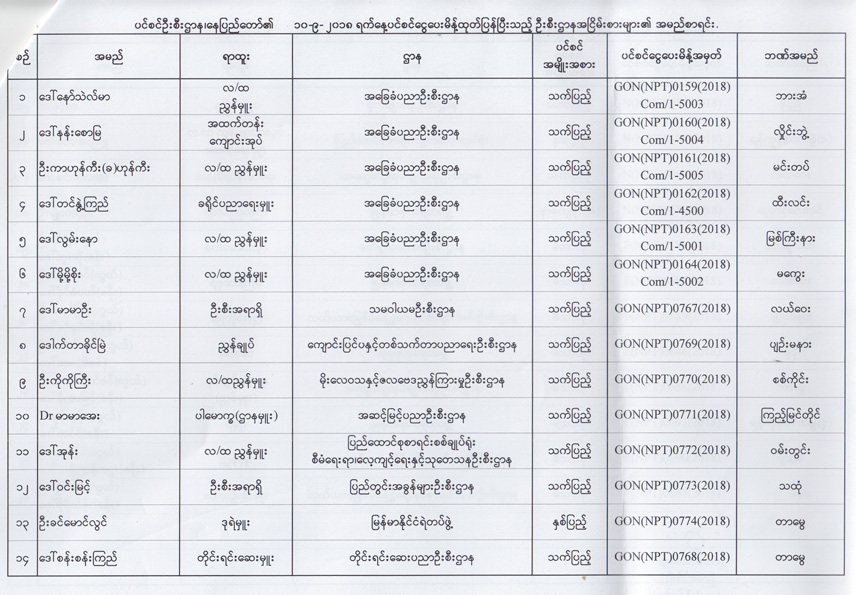 ပင်စင်ဦးစီးဌာန၊ နေပြည်တော်၏ ၁၀-၉-၂၀၁၈ ရက်နေ့ ပင်စင်ငွေပေးမိန့်ထုတ်ပြန်ပြီးသည့် ဦးစီးဌာနအငြိမ်းစားများ၏ အမည်စာရင်း