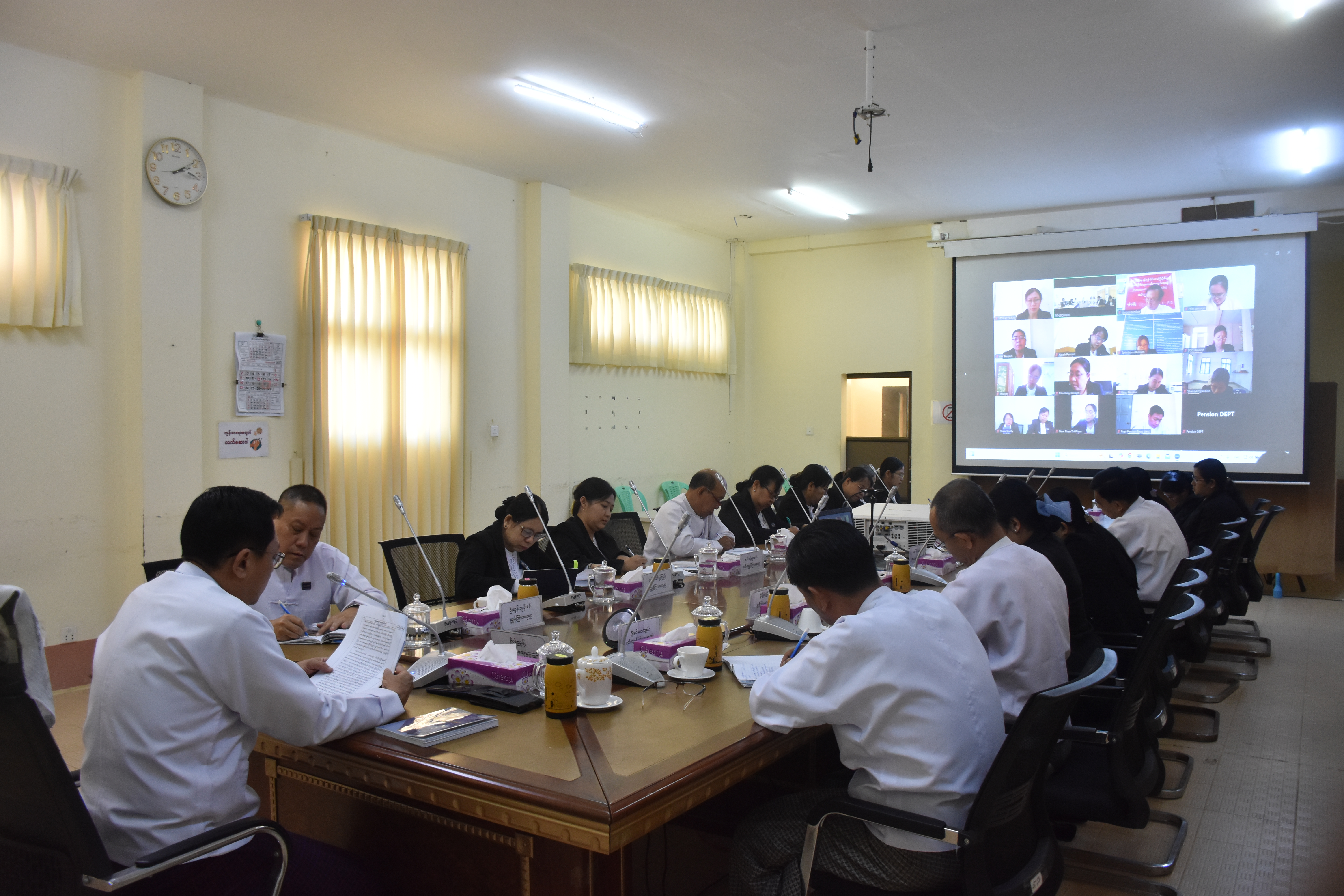 စီမံကိန်းနှင့်ဘဏ္ဍာရေးဝန်ကြီးဌာန၊ ပင်စင်ဦးစီးဌာန(ရုံးချုပ်)နှင့် ပြည်ထောင်စုနယ်မြေ၊ တိုင်းဒေသကြီး/ ပြည်နယ်ဦးစီးမှူးရုံးများ၏ (၂/၂၀၂၅) ကြိမ်မြောက် လုပ်ငန်းညှိနှိုင်းအစည်းအဝေးအား ၂၀-၂-၂၀၂၅ ရက်နေ့၊ ၁၄:၀၀ နာရီအချိန်တွင် ပင်စင်ဦးစီးဌာန၊ အစည်းအဝေးခန်းမ၌ ကျင်းပ ပြုလုပ်ခဲ့ပါသည်။ အဆိုပါအစည်းအဝေးသို့ ပင်စင်ဦးစီးဌာန၊ ညွှန်ကြားရေးမှူးချုပ် ဦးရဲညွန့်၊ ဒုတိယညွှန်ကြားရေးမှူးချုပ်၊ ရုံးချုပ်ရှိ သက်ဆိုင်ရာဌာနခွဲတာဝန်ခံများ၊ ဒုတိယညွှန်ကြားရေးမှူးများ၊ လက်ထောက်ညွှန်ကြားရေးမှူးများ ၊ ပြည်ထောင်စုနယ်မြေတာဝန်ခံတို့ တက်ရောက်ခဲ့ပြီး တိုင်းဒေသကြီး/ပြည်နယ်ဦးစီးမှူးရုံးများမှ Video Conferencing စနစ်ဖြင့် တက်ရောက်ခဲ့ကြပါသည်။