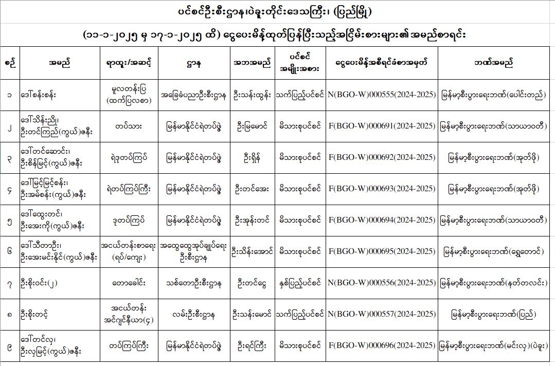 ပင်စင်ဦးစီးဌာန၊ ပဲခူးတိုင်းရုံးခွဲ(ပြည်မြို့)၏ ငွေပေးမိန့်ထုတ်ပြန်မှုစာရင်း (၁၁-၁-၂၀၂၅ မှ ၁၇-၁-၂၀၂၅)