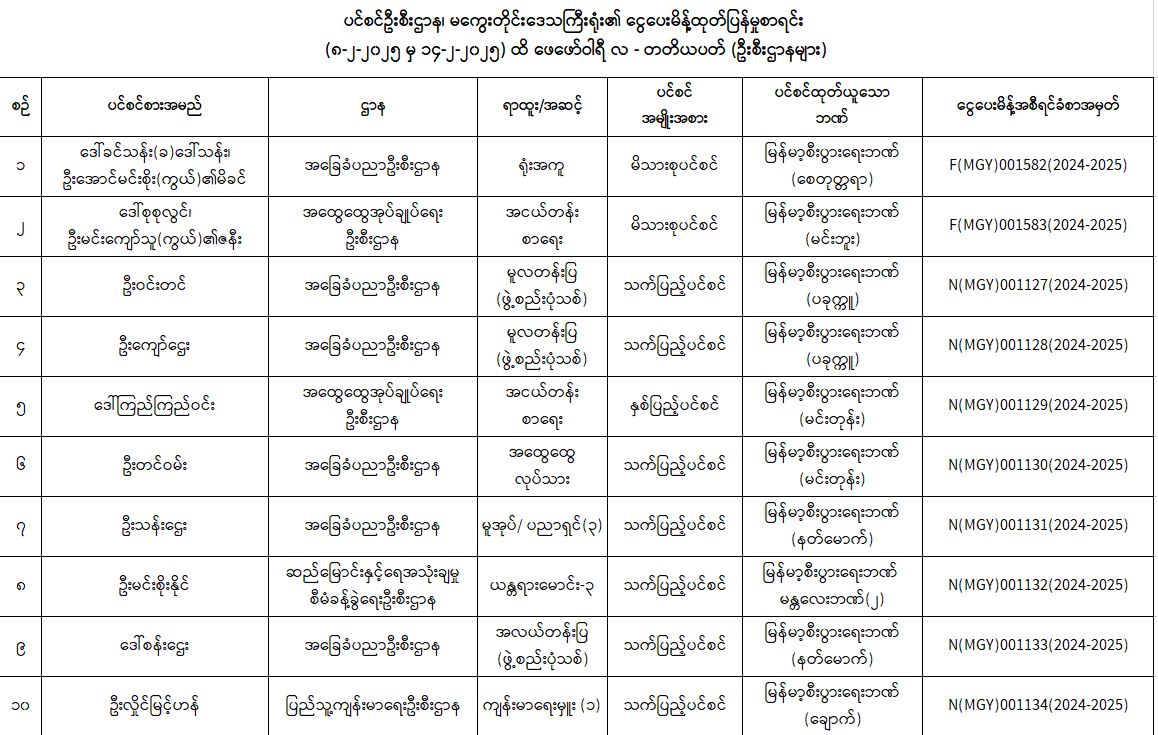 ပင်စင်ဦးစီးဌာန၊ မကွေးတိုင်းဒေသကြီးဦးစီးမှူးရုံး၏ ငွေပေးမိန့်ထုတ်ပြန်မှုစာရင်း ( ၈-၂-၂၀၂၅ မှ ၁၄-၂-၂၀၂၅)