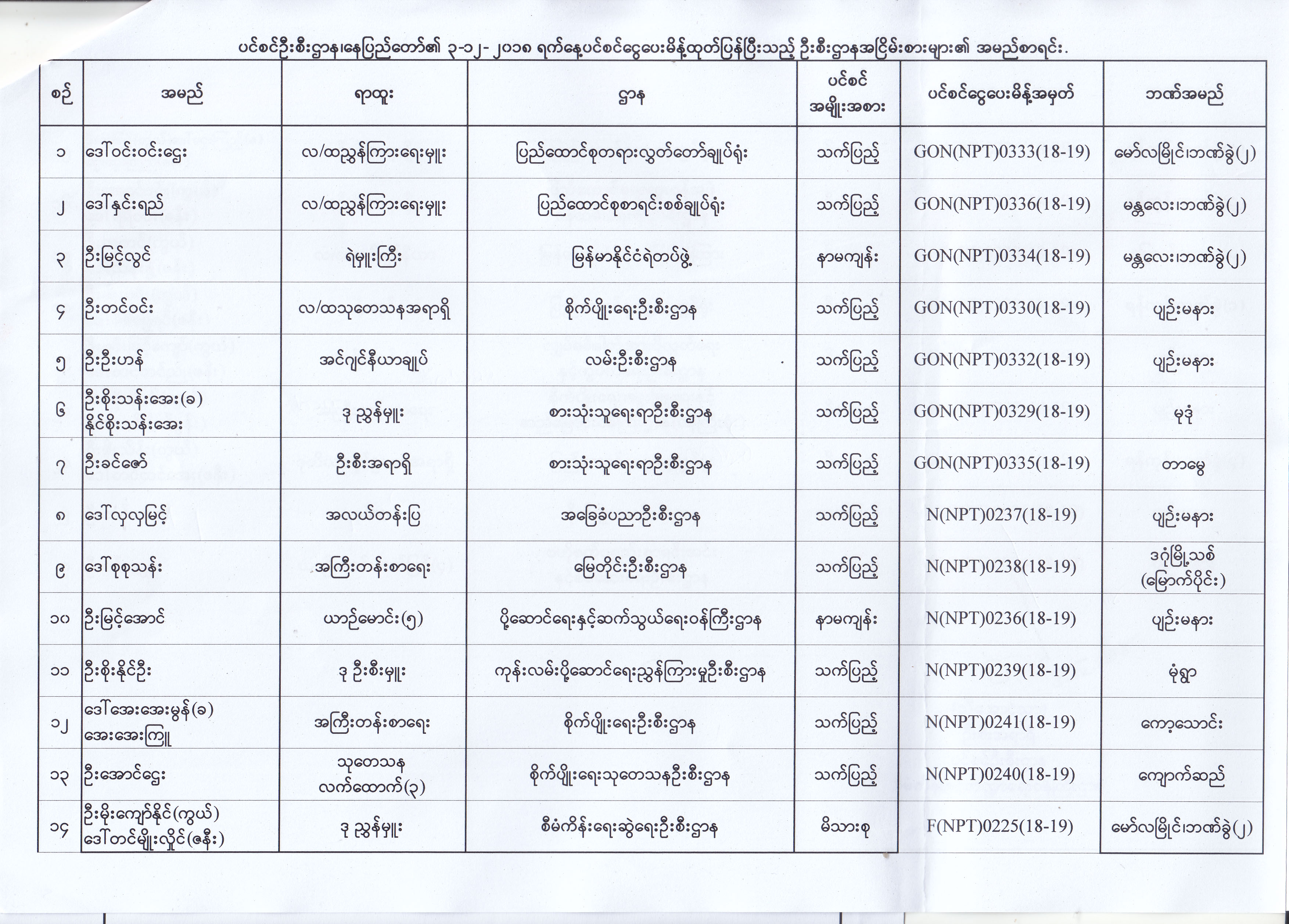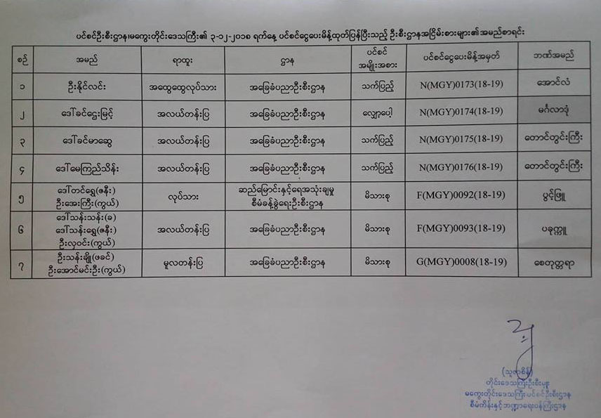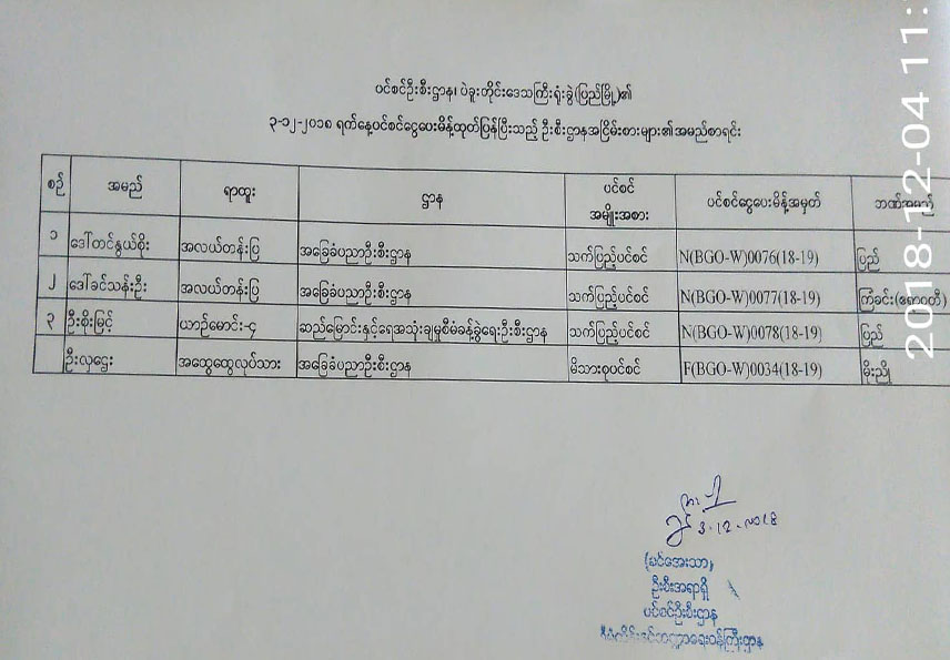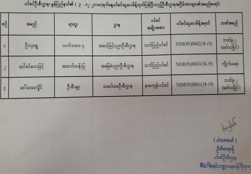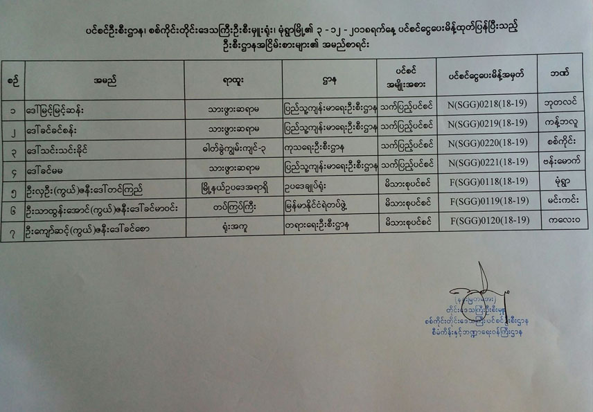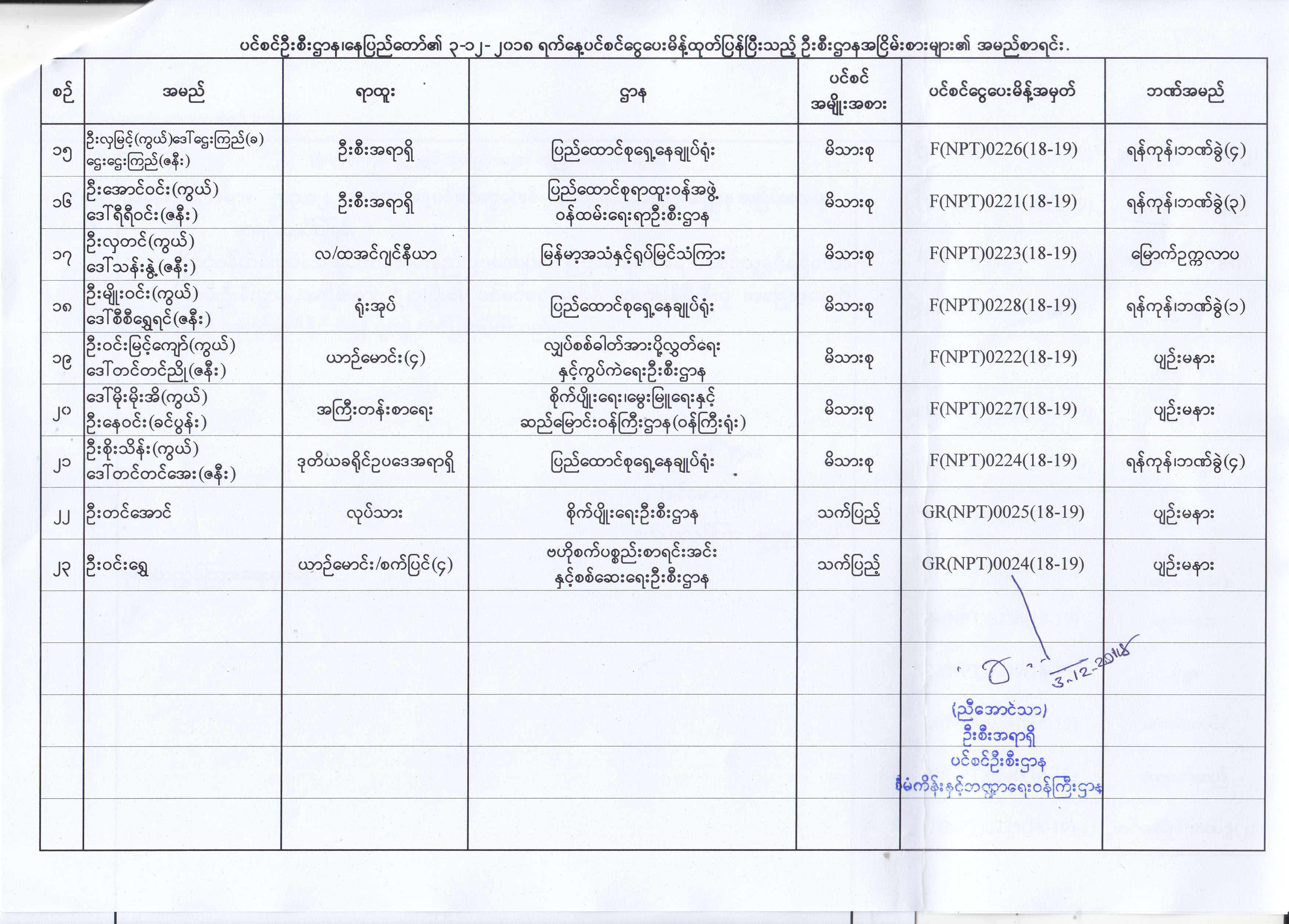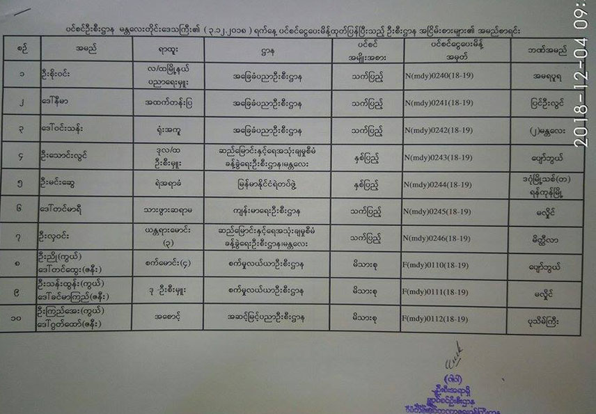 ပင်စင်ဦးစီးဌာန၏ ၃-၁၂-၂၀၁၈ ရက်နေ့ ပင်စင်ငွေပေးမိန့် ထုတ်ပြန်ပြီးသည့် ဦးစီးဌာန အငြိမ်းစားများ၏အမည်စာရင်း