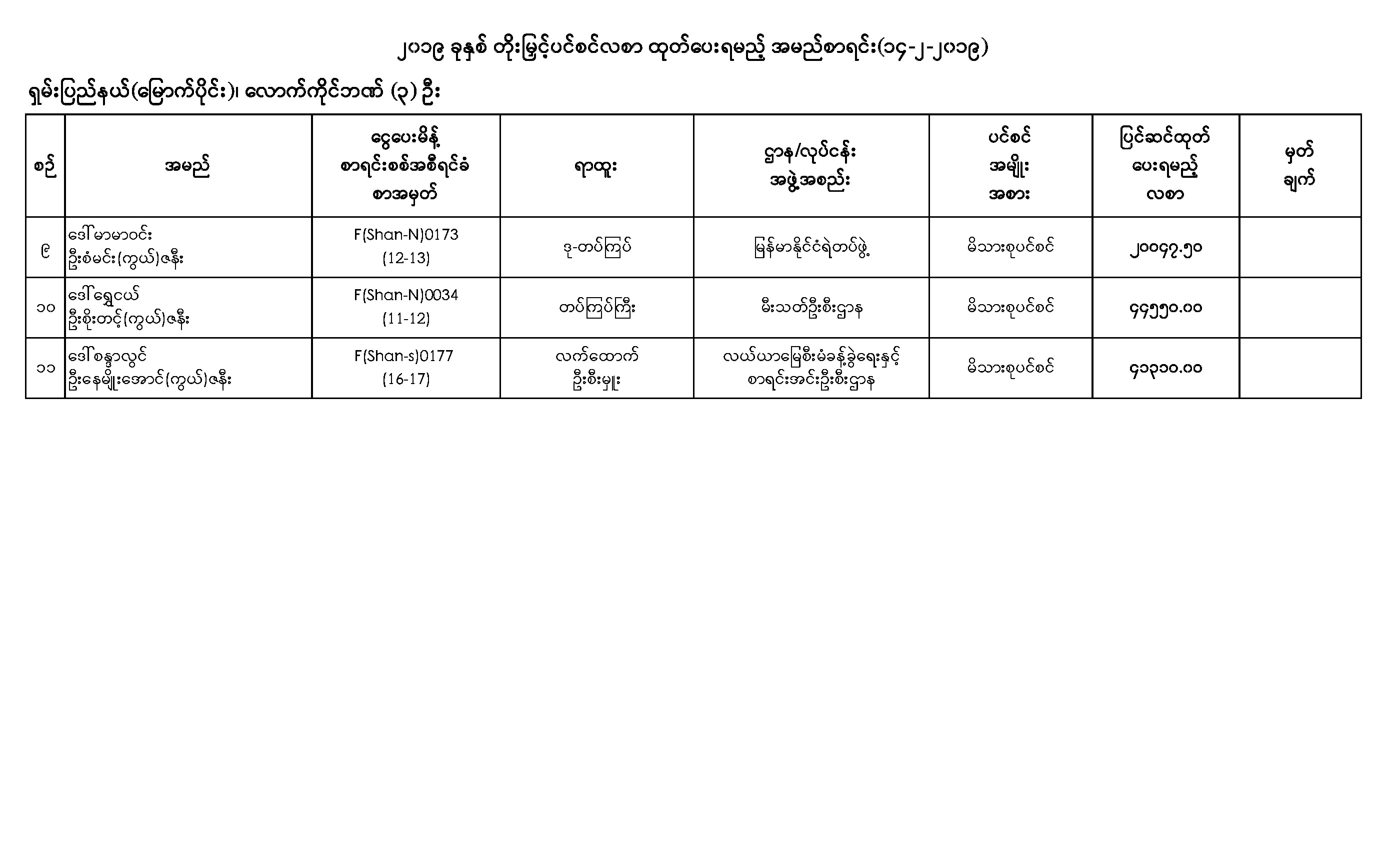 ၂၀၁၉ ခုနှစ်၊ တိုးမြှင့်ပင်စင်လစာထုတ်ပေးရမည့် အမည်စာရင်း (၁၄-၂-၂၀၁၉) ရှမ်းပြည်နယ်(မြောက်ပိုင်း)၊ လောက်ကိုင်ဘဏ် (၃) ဦး pension_editor Sat, 02/16/2019 - 16:02 Attachment Size Louk-Kaing.pdf 47.09 KB