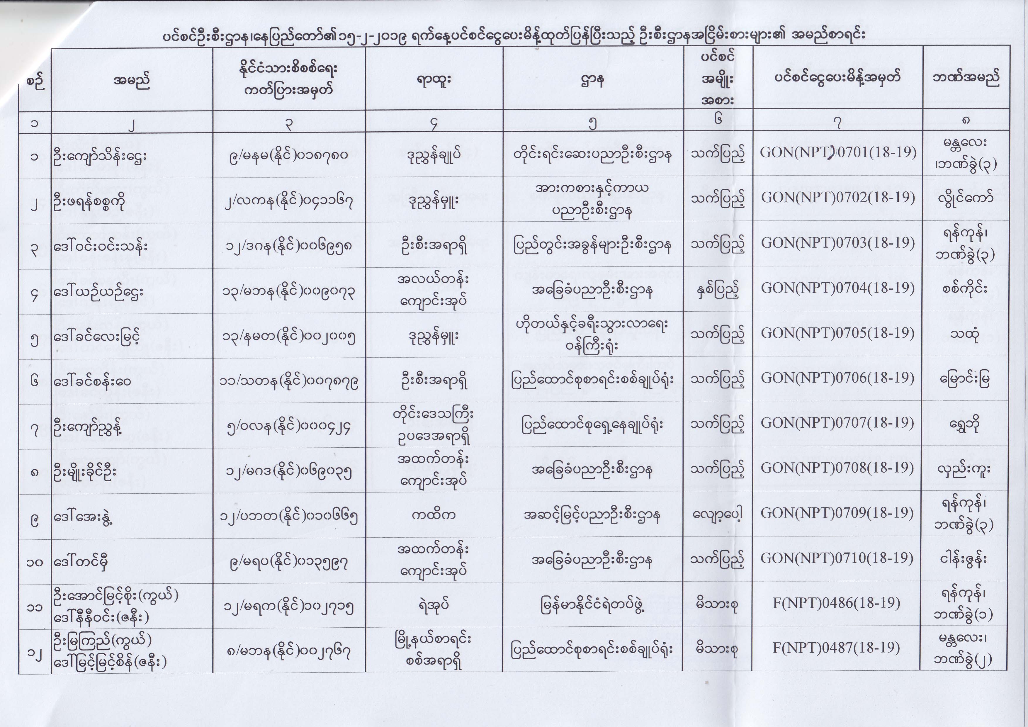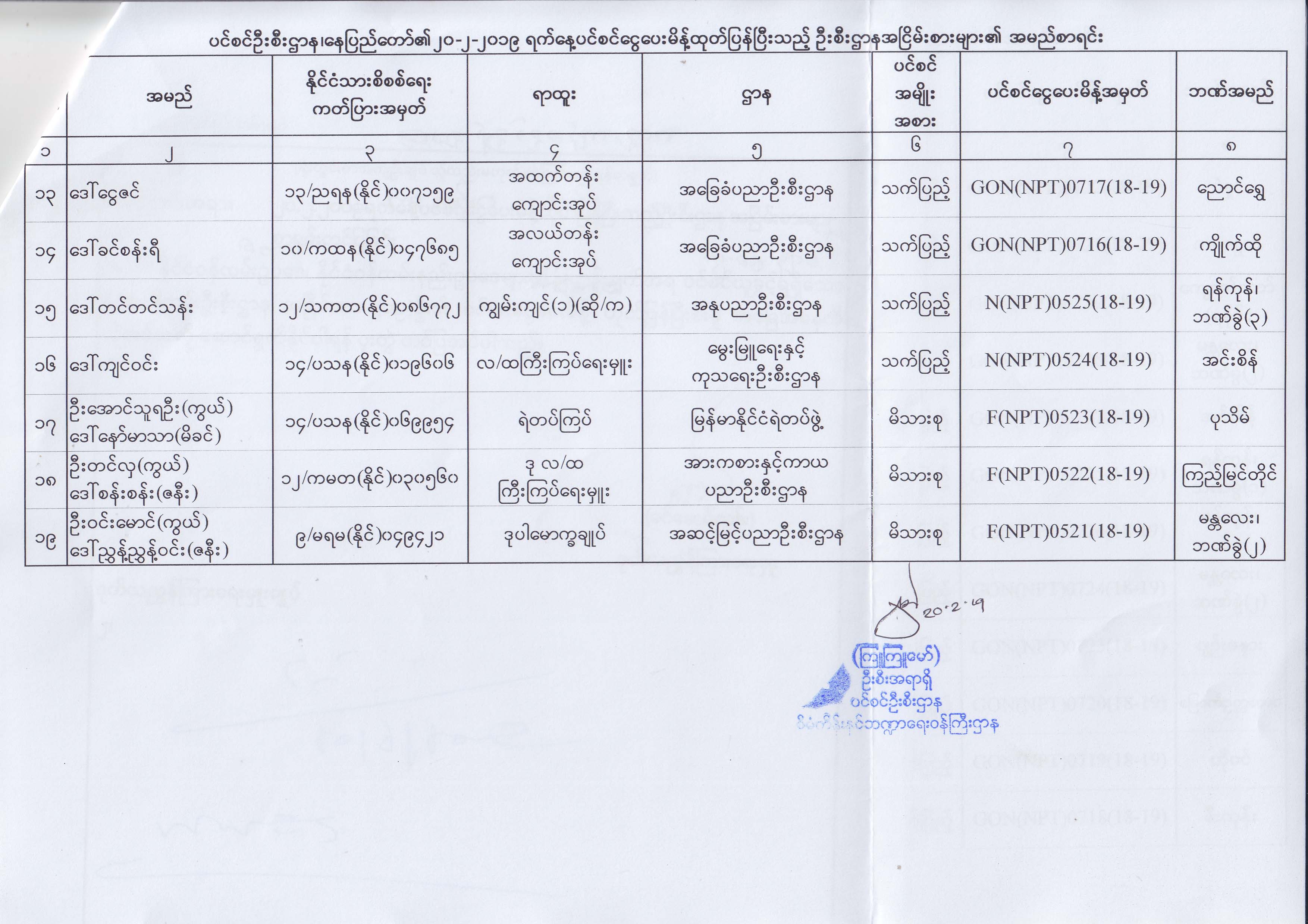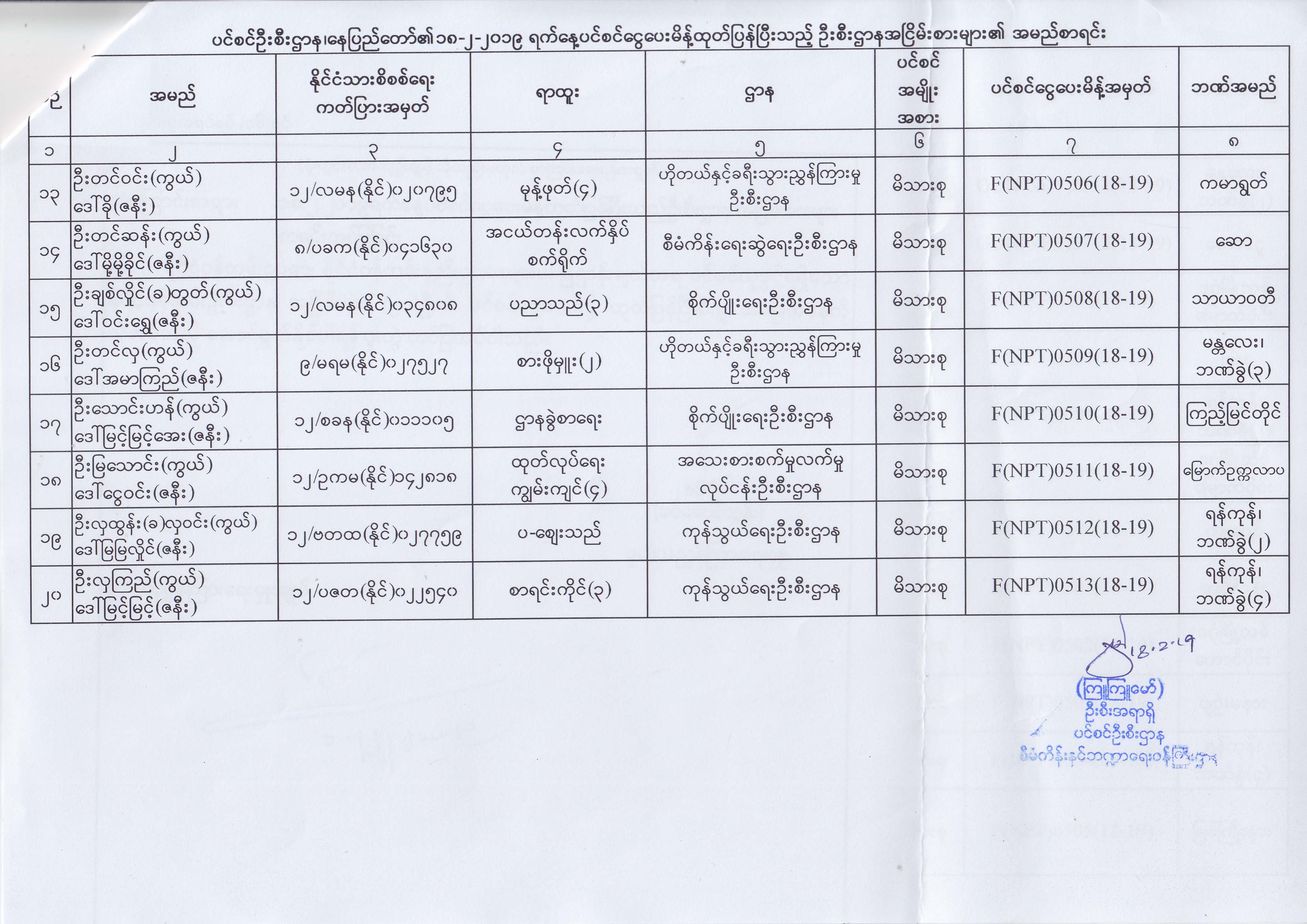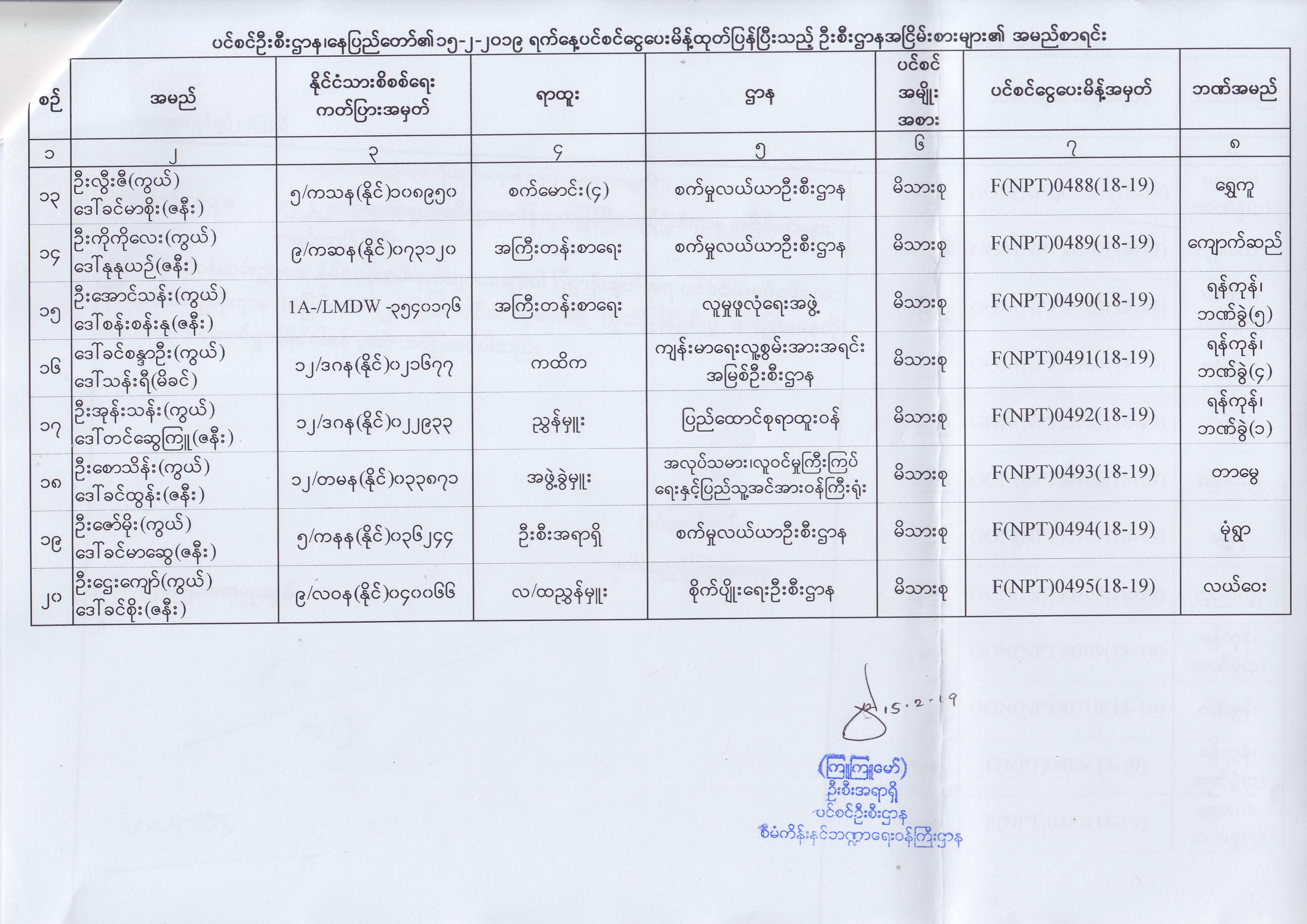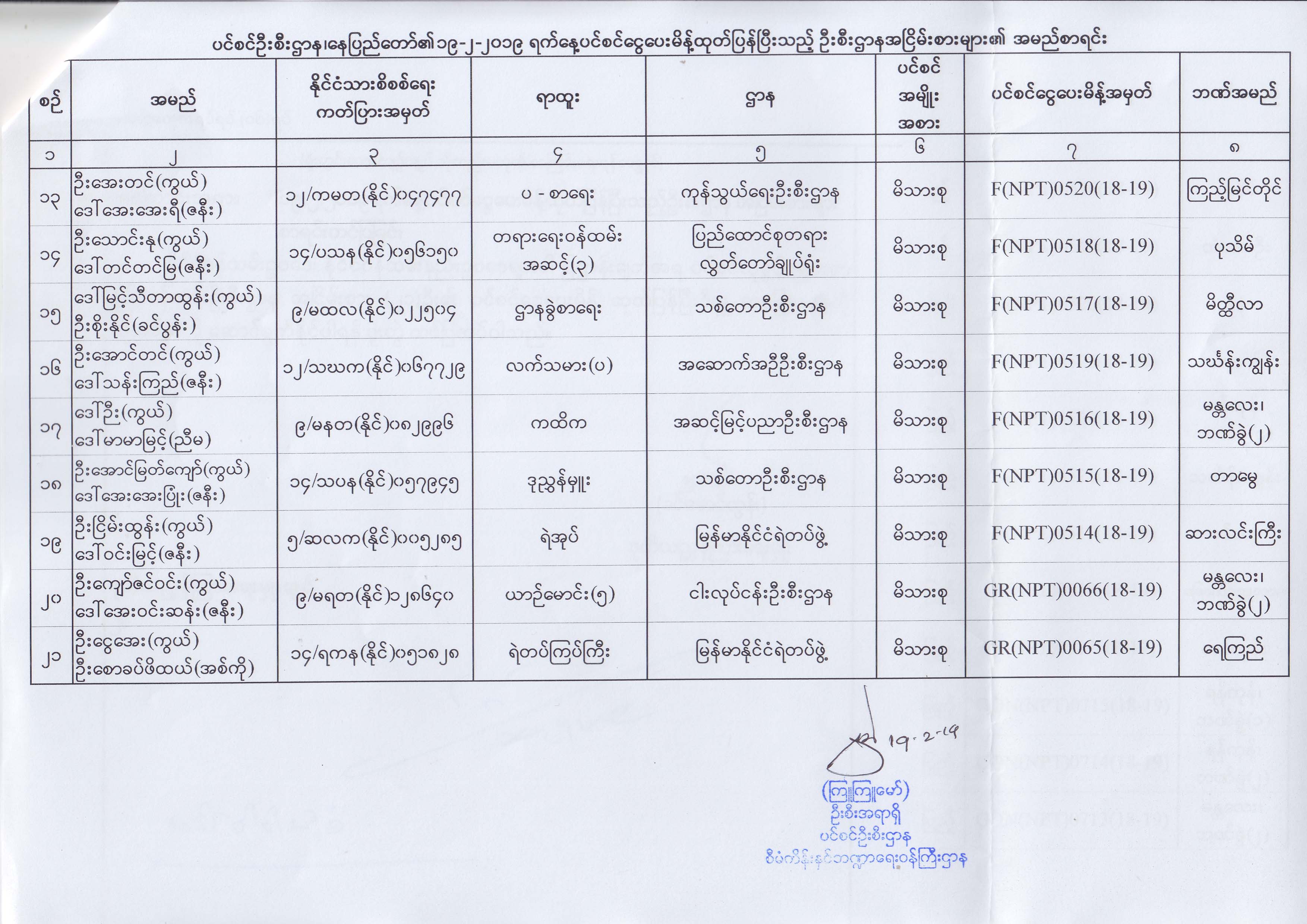 ပင်စင်ဦးစီးဌာန၊ နေပြည်တော်(ရုံးချုပ်)၏ ၁၅.၂.၂၀၁၉ မှ ၂၁.၂.၂၀၁၉ ရက်နေ့အထိ ပင်စင်ငွေပေးမိန့်ထုတ်ပြန်ပြီးသည့် ဦးစီးဌာနအငြိမ်းစားများ၏ အမည်စာရင်း pension_editor Tue, 03/05/2019 - 13:55