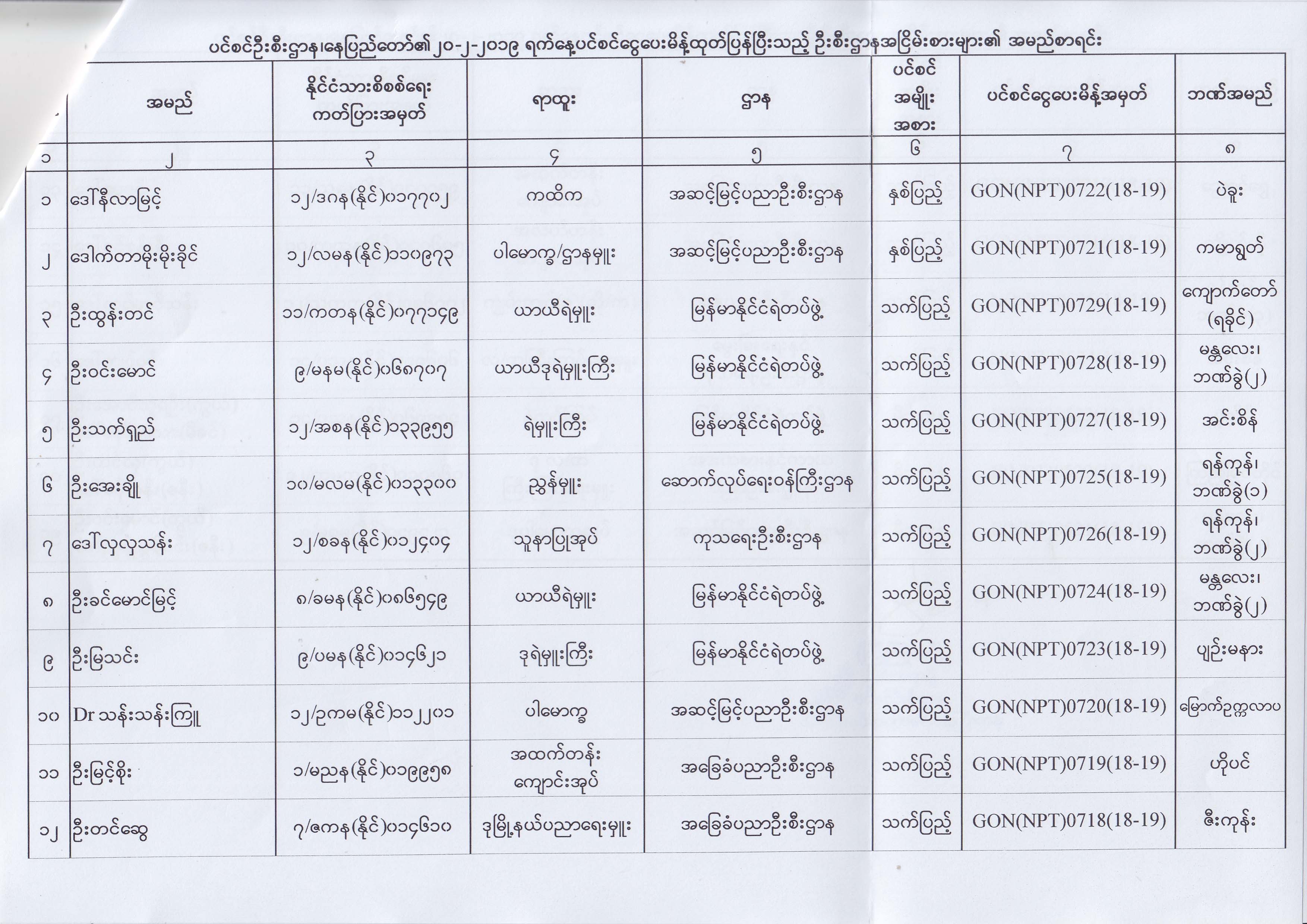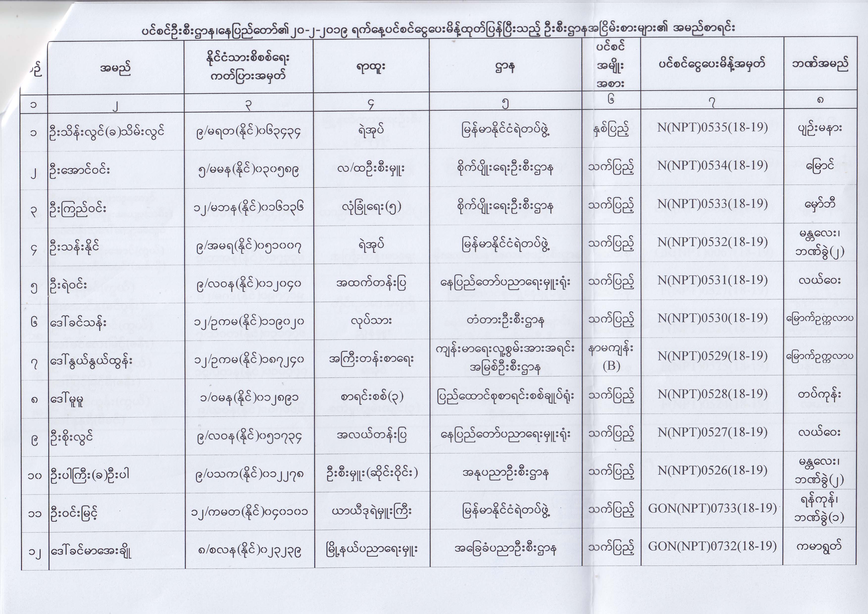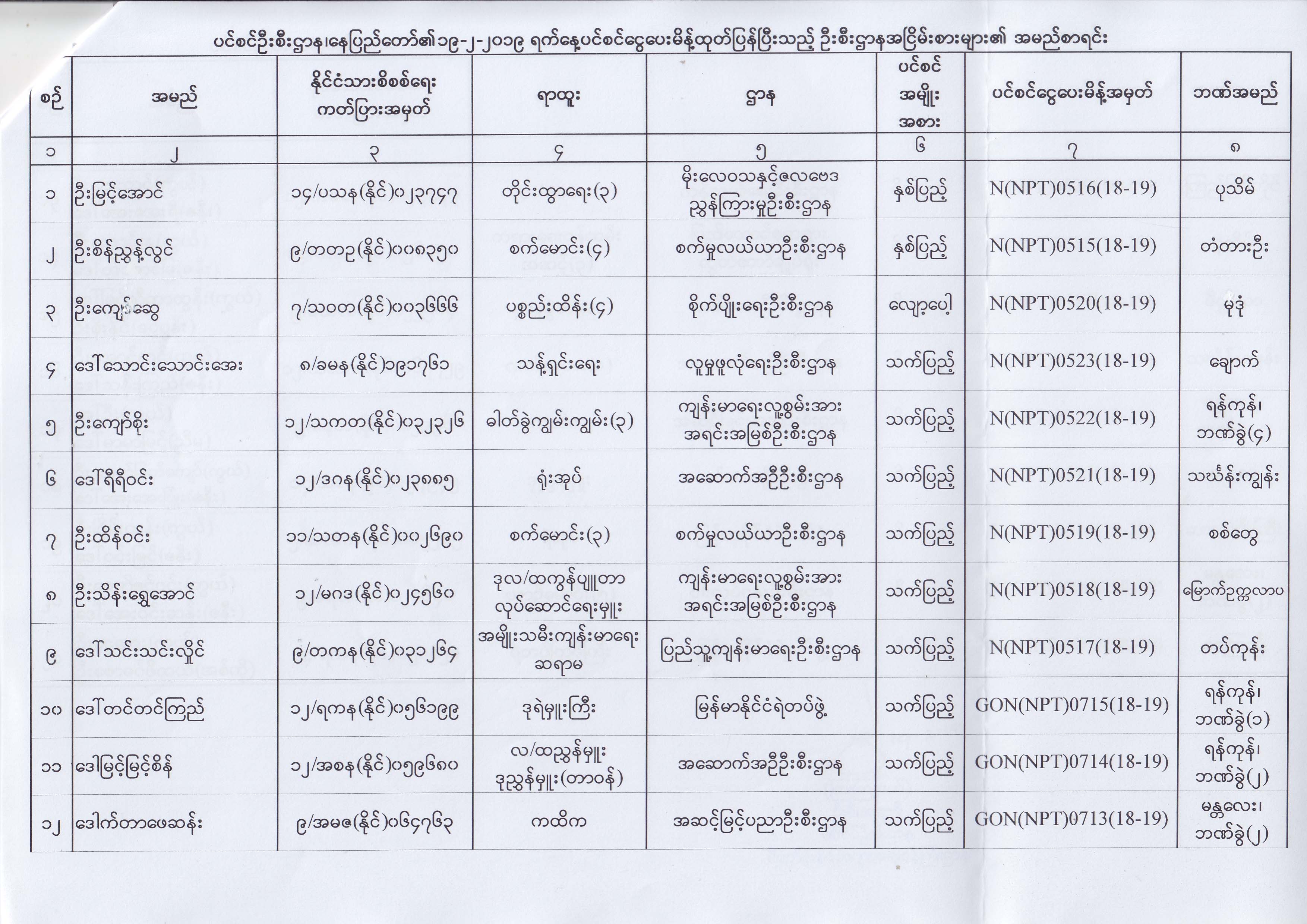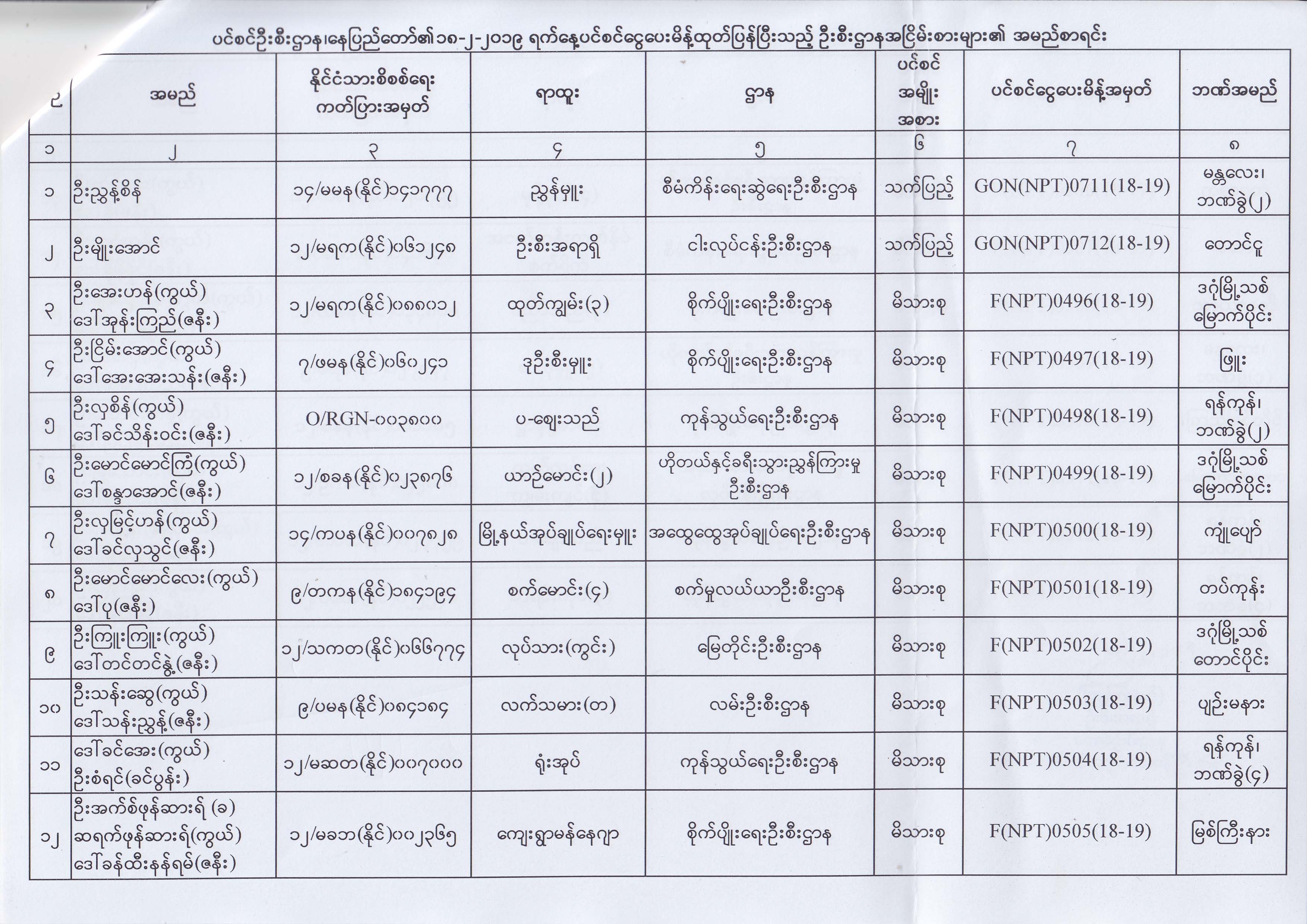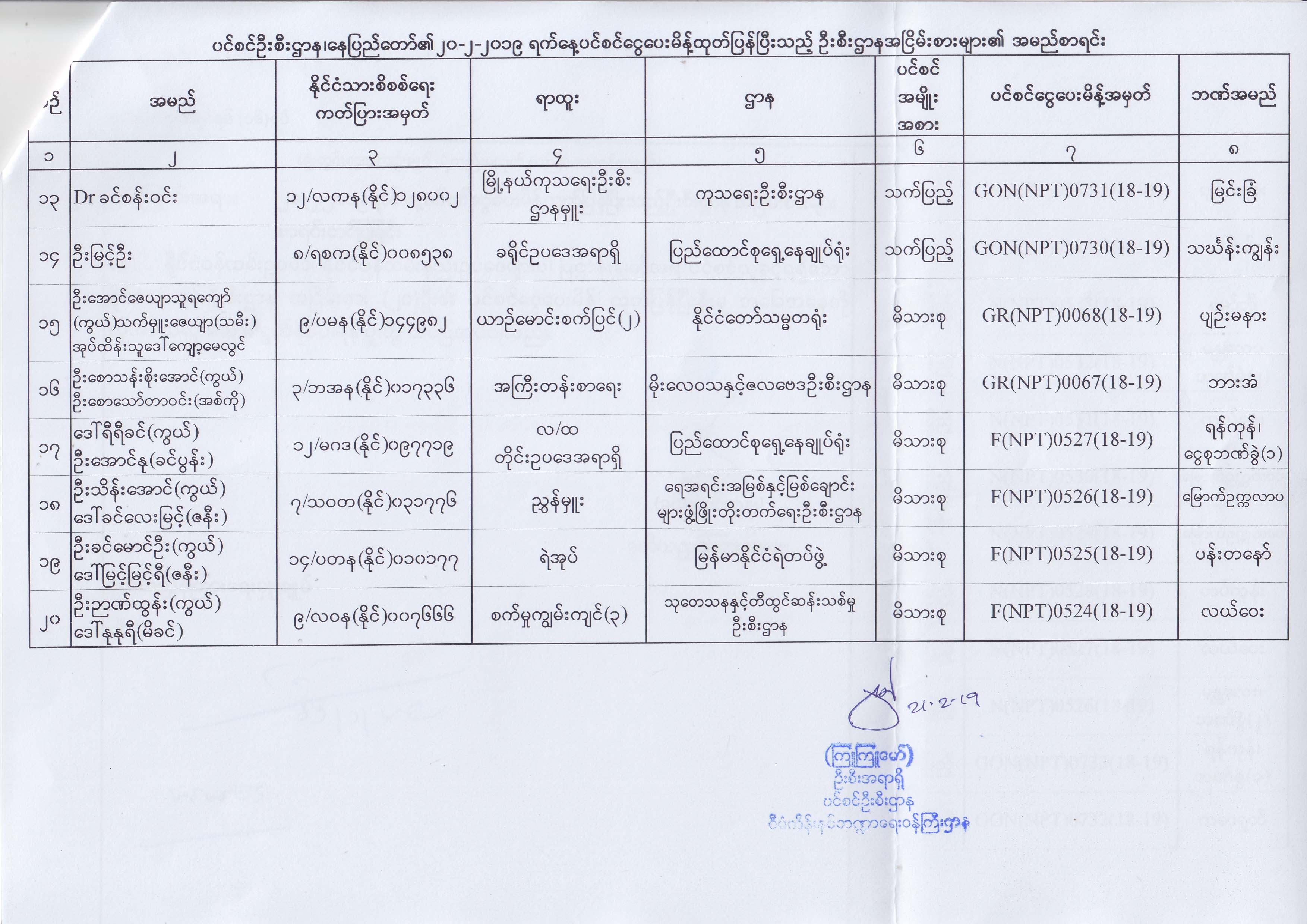 ပင်စင်ဦးစီးဌာန၊ နေပြည်တော်(ရုံးချုပ်)၏ ၁၅.၂.၂၀၁၉ မှ ၂၁.၂.၂၀၁၉ ရက်နေ့အထိ ပင်စင်ငွေပေးမိန့်ထုတ်ပြန်ပြီးသည့် ဦးစီးဌာနအငြိမ်းစားများ၏ အမည်စာရင်း pension_editor Tue, 03/05/2019 - 13:55