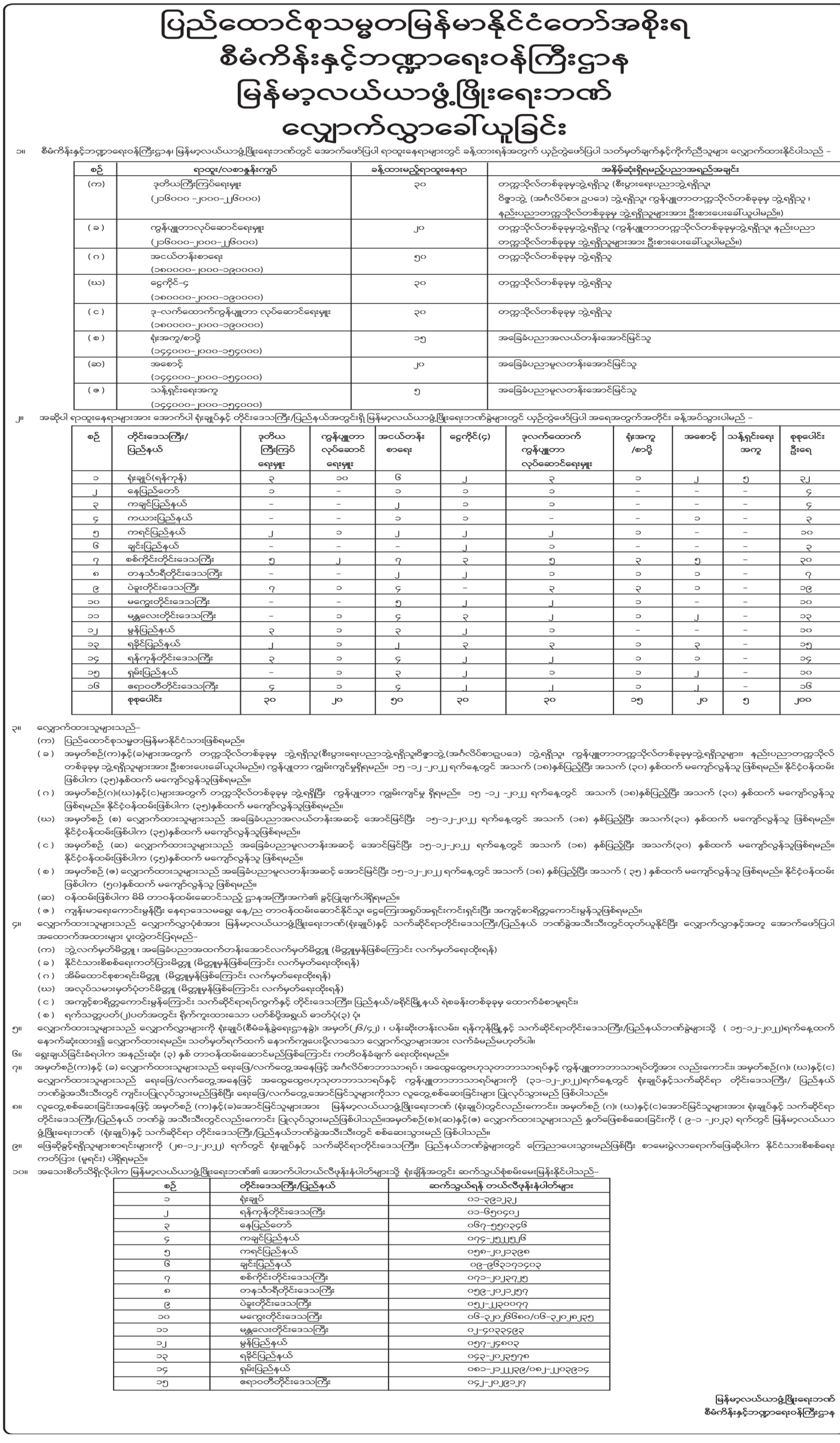 မြန်မာ့လယ်ယာဖွံ့ဖြိုးရေးဘဏ် မှ အငယ်တန်းစာရေး၊ ငွေကိုင်(၄)၊ ဒုလက်ထောက်ကွန်ပျူတာလုပ်ဆောင်ရေးမှူး၊ ရုံးအကူ/စာပို့၊ အစောင့် ရာထူးများအတွက်လျှောက်လွှာခေါ်ယူခြင်း