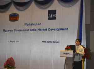 အစိုးရငွေတိုက်စာချုပ်စျေးကွက် ဖွံ့ဖြိုးတိုးတက်ရေးအတွက် Myanmar Government Bond Market Development ခေါင်းစဉ်ဖြင့် အလုပ်ရုံဆွေးနွေးပွဲကို ၂၀၁၈ ခုနှစ်၊ သြဂုတ်လ (၁၁) ရက်နေ့တွင် ရန်ကုန်မြို့ Park Royal Hotel ၌ စီမံကိန်းနှင့်ဘဏ္ဍာရေး ဝန်ကြီးဌာနနှင့် အာရှဖွံ့ဖြိုးရေးဘဏ် (ADB) တို့ ပူးပေါင်း၍ ကျင်းပခဲ့ပါသည်။ ဆွေးနွေးပွဲ သို့ ငွေချေးသက်သေခံလက်မှတ်လုပ်ငန်းကြီးကြပ်ရေးကော်မရှင်၊ မြန်မာနိုင်ငံတော်ဗဟို ဘဏ်၊ နိုင်ငံပိုင်နှင့်ပုဂ္ဂလိကပိုင်ဘဏ်များ၊ နိုင်ငံခြားဘဏ်ခွဲများ၊ ငွေချေးသက်သေခံလက်မှတ် ကုမ္ပဏီများနှင့် အာမခံကုမ္ပဏီများမှ တာဝန်ရှိသူ စုစုပေါင်း (၁၁၀) ဦး တက်ရောက်ခဲ့ပါ သည်။ စီမံကိန်းနှင့်ဘဏ္ဍ