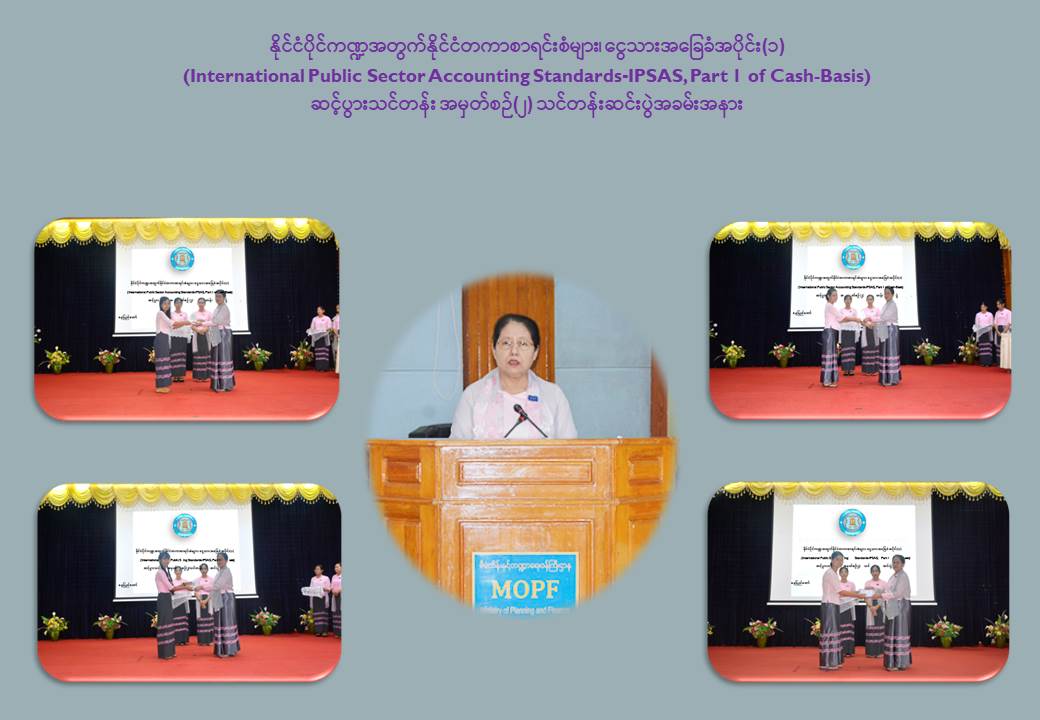 အခမ်းအနားတွင် ငွေတိုက်ဦးစီးဌာန၊ ညွှန်ကြားရေးမှူးချုပ်က IPSAS ကိုဝန်ထမ်းများအနေဖြင့် ရင်းနှီးပြီးသားလို့ယုံကြည်ပါကြောင်း၊ IPSASကို အကောင်အထည်ဖော်ရန် ကမ္ဘာ့ဘဏ်၏ အကူအညီဖြင့် Gap Analysis Report ကို ဦးစွာရေးဆွဲပြီး Transition Plan and Roadmap ကိုချမှတ်၍ IPSAS ကို စတင်ဆောင်ရွက်ခဲ့ပါကြောင်း၊ IPSAS အကောင်အထည်ဖော်ဆောင်ရွက်ရမည့်အပိုင်းကို  စီမံကိန်းနှင့်ဘဏ္ဍာရေးဝန်ကြီးဌာနအနေဖြင့် တာဝန်ယူဆောင်ရွက်ရပါကြောင်း၊ IPSAS သည် အစိုးရဌာန/အဖွဲ့အစည်းများအားလုံးနှင့် သက်ဆိုင်ပါကြောင်း၊ IPSAS ကို ဆက်လက်အကောင်အထည်ဖော် ဆောင်ရွက်နိုင်ရန်အတွက် Roadmap ပါ Timeline အား ပြင်ဆင်ရေးဆွဲ၍ ၎င်းနှင့်အညီ အကောင်အထည်ဖော်ဆောင်ရွက်လျက်ရှိပါကြောင်း၊ နိုင်ငံတကာစာရင်းစံများနှင့်အညီ စာရင်းများကိုအစီရင်ခံ တင်ပြနိုင်ရန်အတွက် နိုင်ငံပိုင်ကဏ္ဍအတွက် နိုင်ငံတကာစာရင်းစံများငွေသား အခြေခံအပိုင်း(၁) (International Public Sector Accounting Standards –IPSAS) Part 1 of Cash Basis သင်တန်းကို ငွေတိုက်ဦးစီးဌာနနှင့် ရသုံးမှန်းခြေငွေစာရင်းဦးစီးဌာနတို့မှ အရာထမ်း၊ အမှုထမ်း (၅၀) ဦးစီဖြင့် စုစုပေါင်း သင်တန်းသား/သူ (၁၀၀) ဦးတို့အား Training for Trainer အဖြစ် ပြည်ထောင်စုစာရင်းစစ်ချုပ်ရုံးမှ ဉီးစွာသင်ကြားပို့ချပေးခဲ့ပါကြောင်း၊ ဆက်လက်ပြီး ငွေတိုက်ဦးစီးဌာနနှင့် ရသုံးမှန်းခြေငွေစာရင်းဦးစီးဌာနတို့မှ ဌာနတွင်း ဆင့်ပွားသင်တန်းများကိုလည်း ပို့ချလျက်ရှိပါကြောင်း၊ လက်ရှိတွင် ဌာနမှ ကနဦး Pilot အနေဖြင့် ၂၀၁၈-၂၀၁၉ ဘဏ္ဍာရေးနှစ်အတွက် Statement of Cash Receipts and Payments နဲ့ Statement of Comparison of Budget and Actual Amount တို့ကို စာရင်းပေါင်းချုပ်ပြုစုရေးနှင့်အစီရင်ခံရေးဌာနခွဲရှိ လစဉ်စာရင်းများဖြင့် ရေးဆွဲခဲ့ပါကြောင်း၊ ယခုအခါ ၂၀၁၉-၂၀၂၀ ဘဏ္ဍာရေးနှစ်အတွက် ယခင်နှစ် Statement များအပေါ် လိုအပ်ချက်များကို ထည့်သွင်းရေးဆွဲနိုင်ရေးအတွက်  အစည်းအဝေးများကျင်းပပြီး ညှိနှိုင်းဆွေးနွေး ဆောင်ရွက်လျက်ရှိပါကြောင်း၊ ဤဉီးစီးဌာနတွင် တာဝန်ယူဆောင်ရွက်နေကြတဲ့ ဝန်ထမ်းများဖြစ်သည့်အတွက် အချို့သောဝန်ထမ်းများသည် မိမိလုပ်ငန်းတာဝန်များနှင့် တိုက်ရိုက်ဆက်စပ်မှုမရှိသော်လည်း တစ်ချိန်ချိန်တွင် ပြန်လည်အသုံးချနိုင်ရန်နှင့် အသိပညာဗဟုသုတ ရရှိရန် ဤသင်တန်းကို တက်ရောက်စေခဲ့ခြင်းဖြစ်ပါကြောင်း၊ ဝန်ထမ်းများအနေဖြင့်IPSAS နှင့်ပတ်သက်သည့်အကြောင်းအရာများအား ကိုယ်တိုင်လေ့လာသင်ယူခြင်း (Self Study) ဖြင့်စဉ်ဆက်မပြတ် ထပ်မံလေ့လာပြီး မိမိကိုယ်မိမိ ပိုမိုတိုးတက်မှုရှိအောင် ကြိုးစားလေ့လာစေလိုပါကြောင်း၊ မိမိတို့ ဌာနခွဲအလိုက် သက်ဆိုင်ရာလုပ်ငန်းတာဝန်များကို ကျွမ်းကျင်ပိုင်နိုင်စွာ ဆောင်ရွက်နိုင်ပြီး မိမိဌာနအတွက်၊ နိုင်ငံတော်အတွက် အားကိုးအားထားပြုရတဲ့နိုင်ငံ့ဝန်ထမ်းကောင်းများဖြစ်လာစေရန် ဆန္ဒပြ