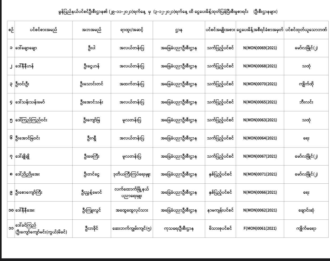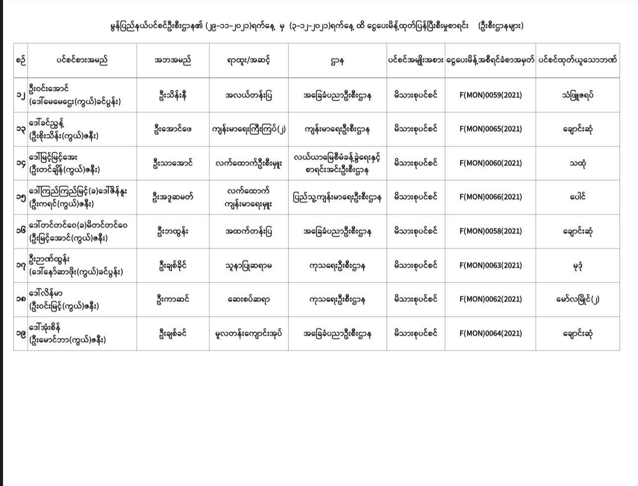 ပင်စင်ဦးစီးဌာန၊ မွန်ပြည်နယ်၏ ငွေပေးမိန့်ထုတ်ပြန်မှုစာရင်း (၂၉-၁၁-၂၀၂၁ မှ ၃-၁၂-၂၀၂၁) pdfinance_editor Wed, 12/15/2021 - 12:58