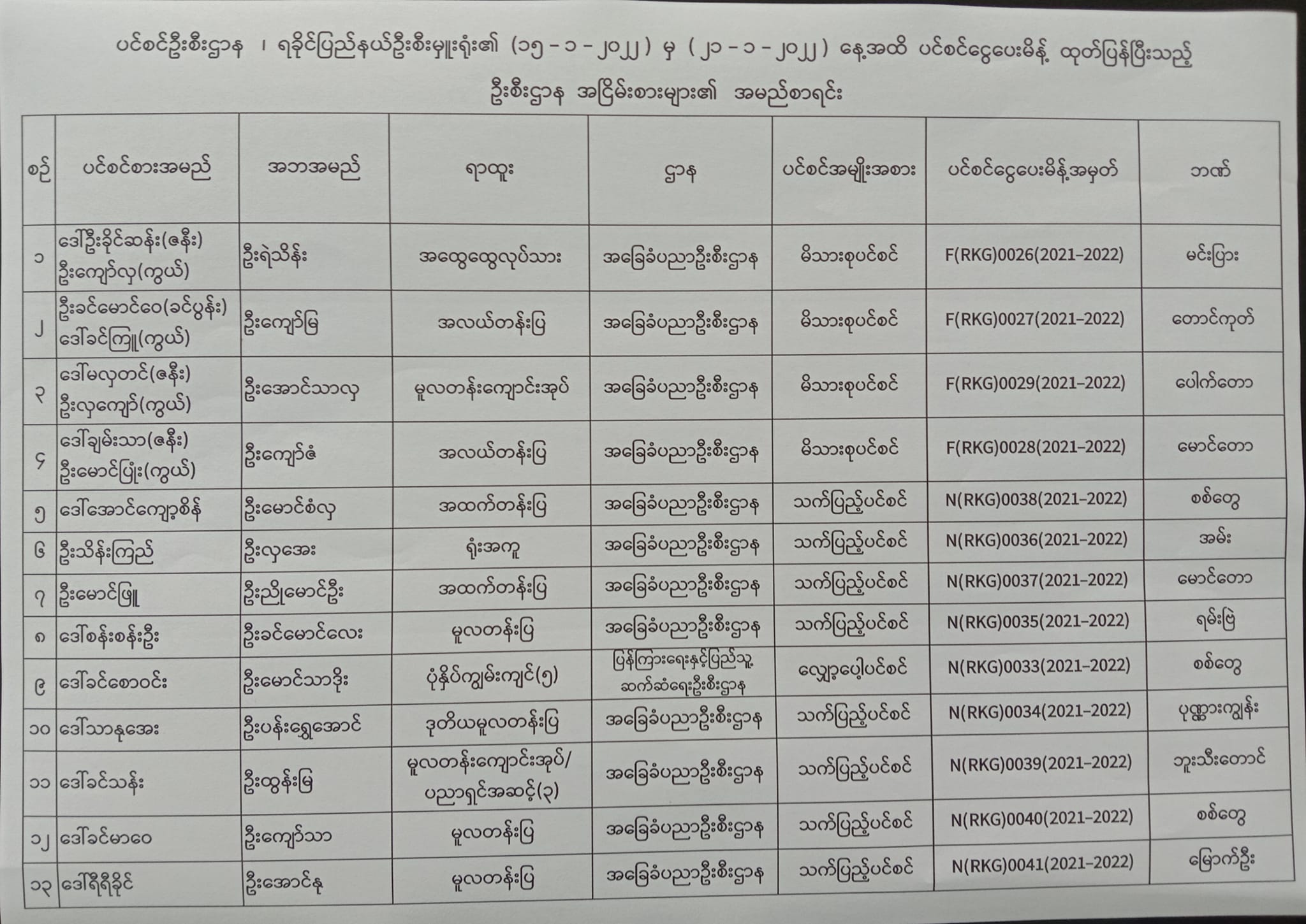 ပင်စင်ဦးစီးဌာန၊ ရခိုင်ပြည်နယ်ဦးစီးမှူးရုံး၏ ငွေပေးမိန့်ထုတ်ပြန်မှုစာရင်း (၁၅-၁-၂၀၂၂ မှ ၂၁-၁-၂၀၂၂) pdfinance_editor Fri, 01/21/2022 - 12:01
