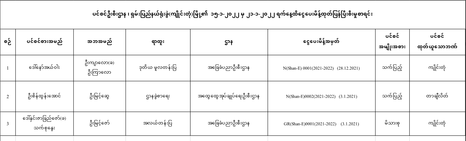 ပင်စင်ဦးစီးဌာန၊ ရှမ်းပြည်နယ်ရုံးခွဲ(ကျိုင်းတုံမြို့)၏ ငွေပေးမိန့်ထုတ်ပြန်မှုစာရင်း (၁၅-၁-၂၀၂၂ မှ ၂၁-၁-၂၀၂၂)