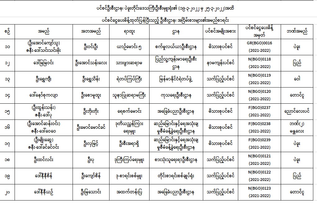 ပင်စင်ဦးစီးဌာန၊ ပဲခူးတိုင်းဒေသကြီးဦးစီးမှူးရုံး၏ ငွေပေးမိန့်ထုတ်ပြန်မှုစာရင်း (၁၉-၂-၂၀၂၂ မှ ၂၅-၂-၂၀၂၂) pdfinance_editor Fri, 03/04/2022 - 10:35