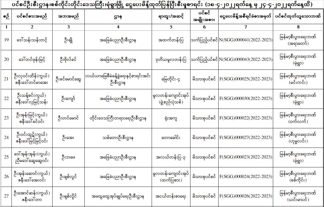 ပင်စင်ဦးစီးဌာန၊ စစ်ကိုင်းတိုင်းဒေသကြီးဦးစီးမှူးရုံး၏ ငွေပေးမိန့်ထုတ်ပြန်မှုစာရင်း (၁၈-၄-၂၀၂၂ မှ ၂၄-၄-၂၀၂၂) pdfinance_editor Wed, 05/04/2022 - 14:28