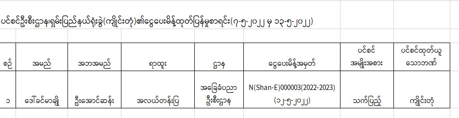 ပင်စင်ဦးစီးဌာန၊ ရှမ်းပြည်နယ်ရုံးခွဲ(ကျိုင်းတုံမြို့)၏ ငွေပေးမိန့်ထုတ်ပြန်မှုစာရင်း (၇-၅-၂၀၂၂ မှ ၁၃-၅-၂၀၂၂) pdfinance_editor Mon, 05/16/2022 - 10:20
