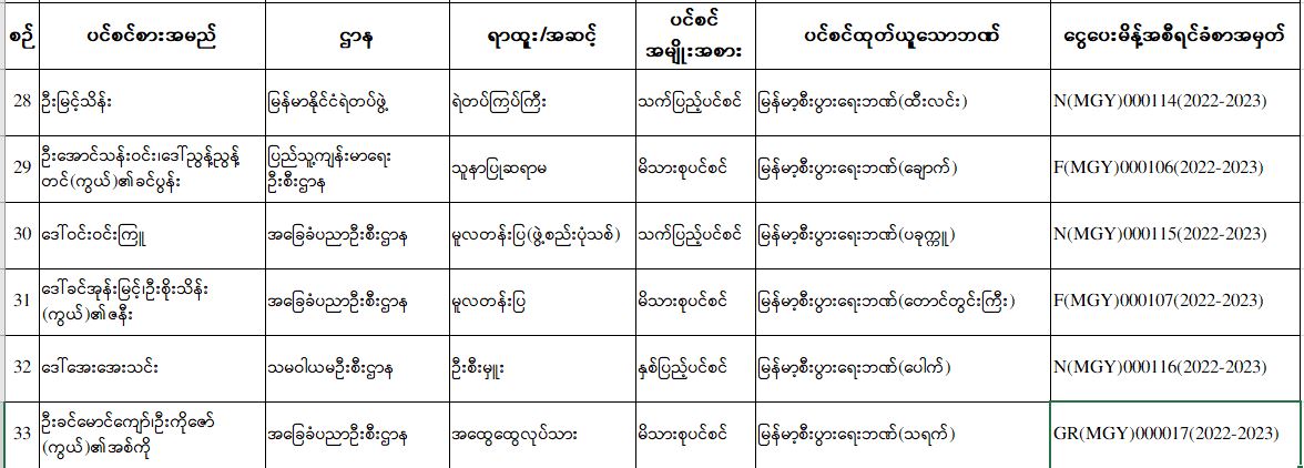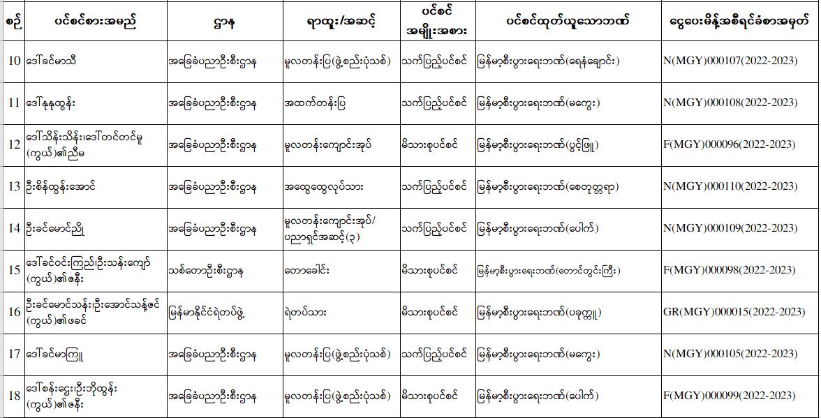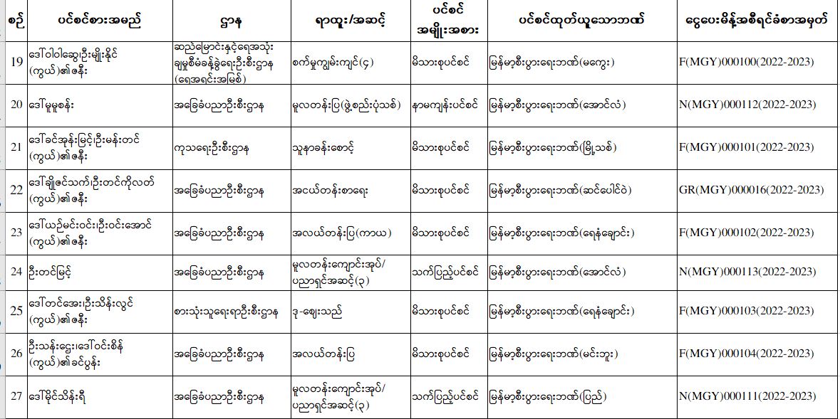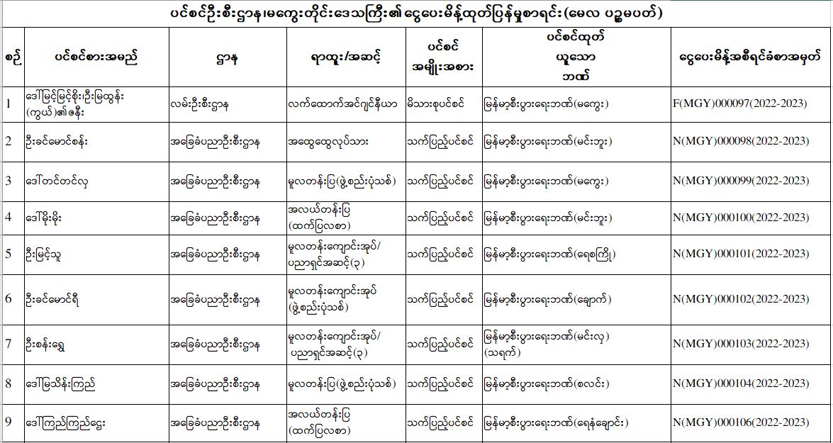 ပင်စင်ဦးစီးဌာန၊ မကွေးတိုင်းဒေသကြီးဦးစီးမှူးရုံး၏ ငွေပေးမိန့်ထုတ်ပြန်မှုစာရင်း (မေလ ပဉ္စမပတ်အတွင်း) pdfinance_editor Fri, 05/27/2022 - 15:58