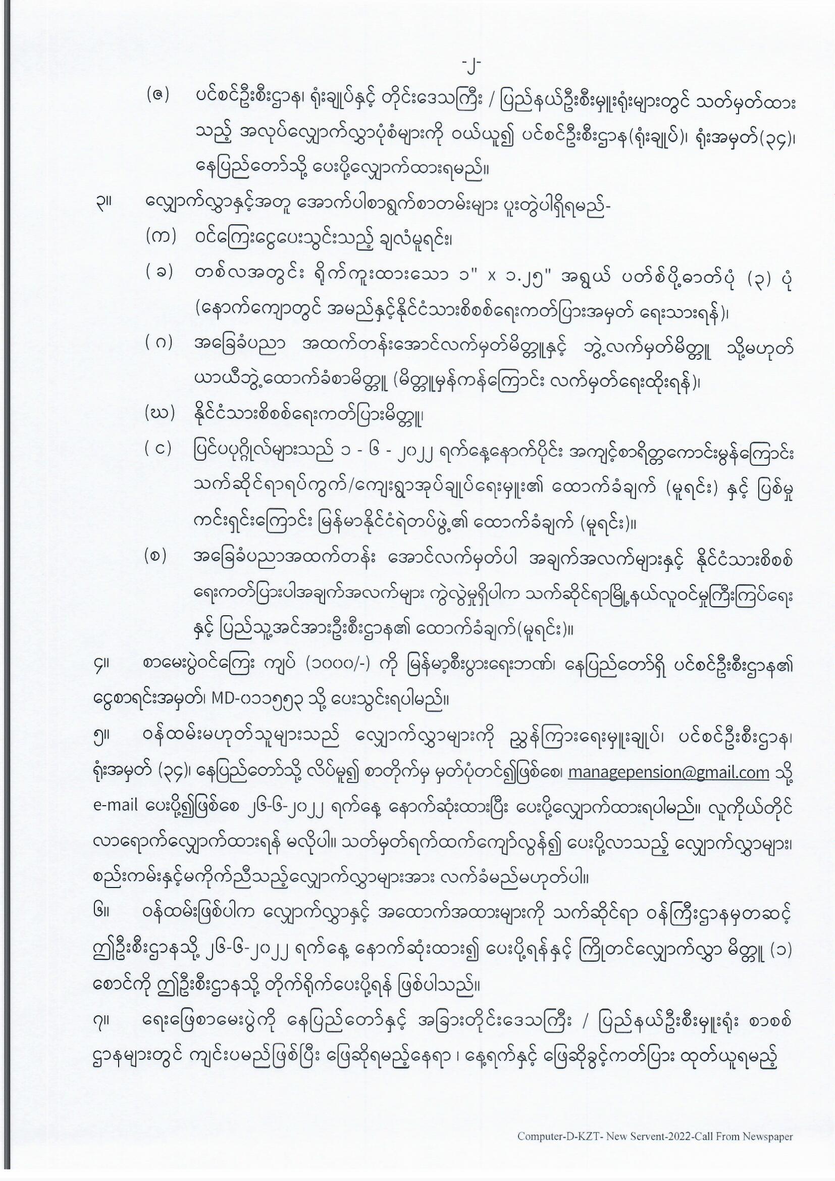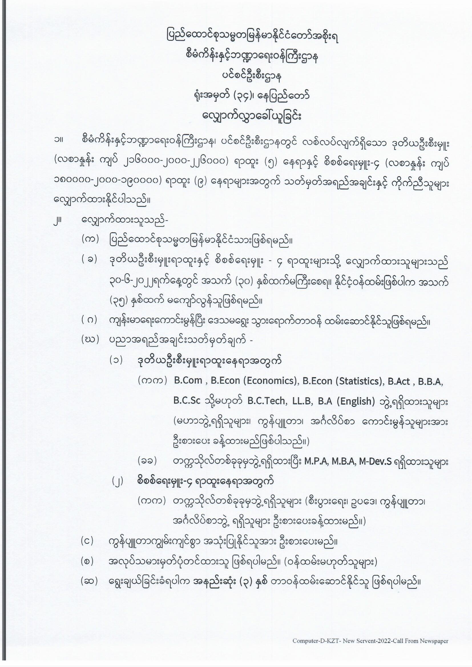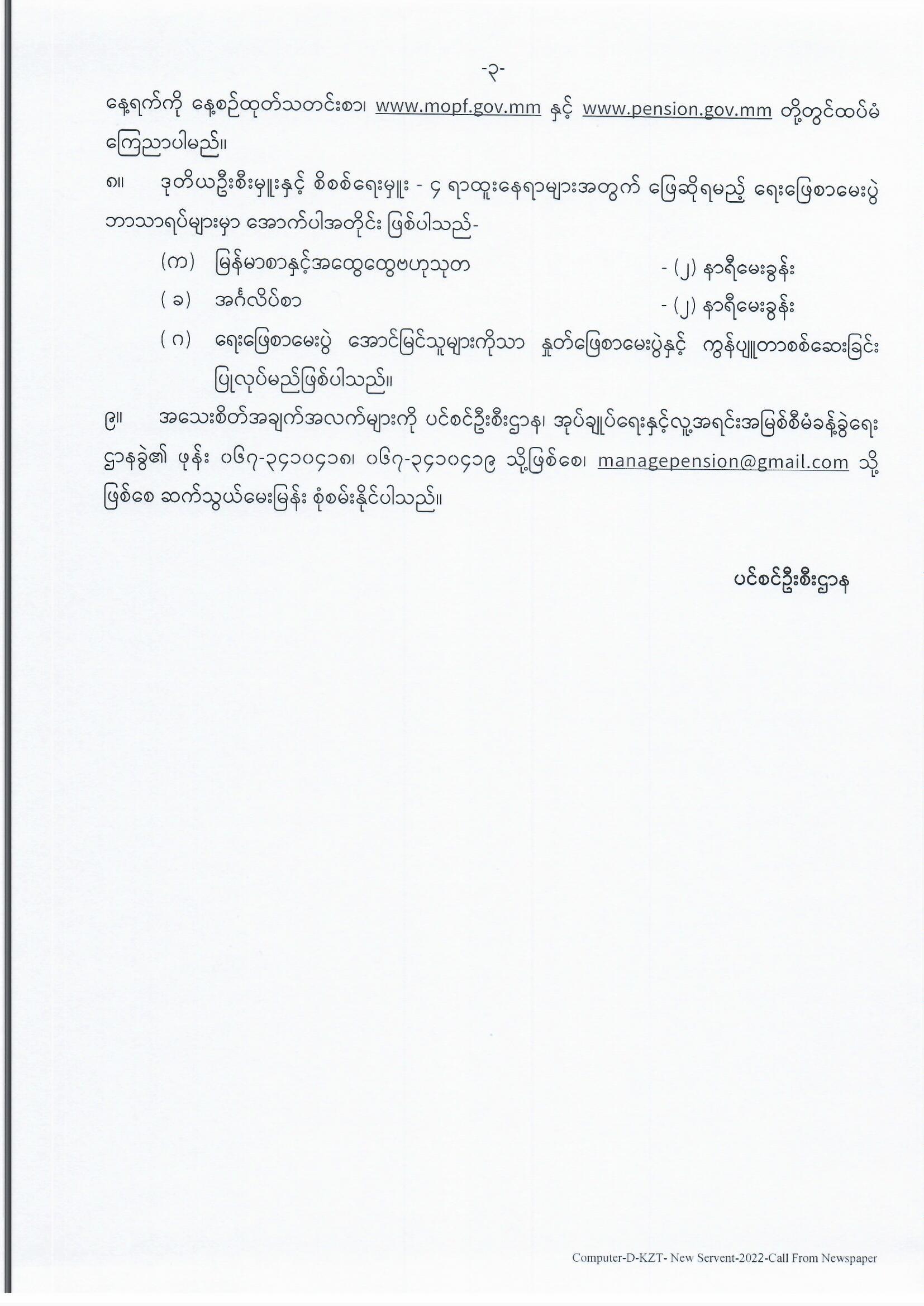စီမံကိန်းနှင့်ဘဏ္ဍာရေးဝန်ကြီးဌာန၊ ပင်စင်ဦးစီးဌာနတွင် လစ်လပ်လျက်ရှိသော အမှုထမ်း (၁၄) နေရာခေါ်ယူခြင်း