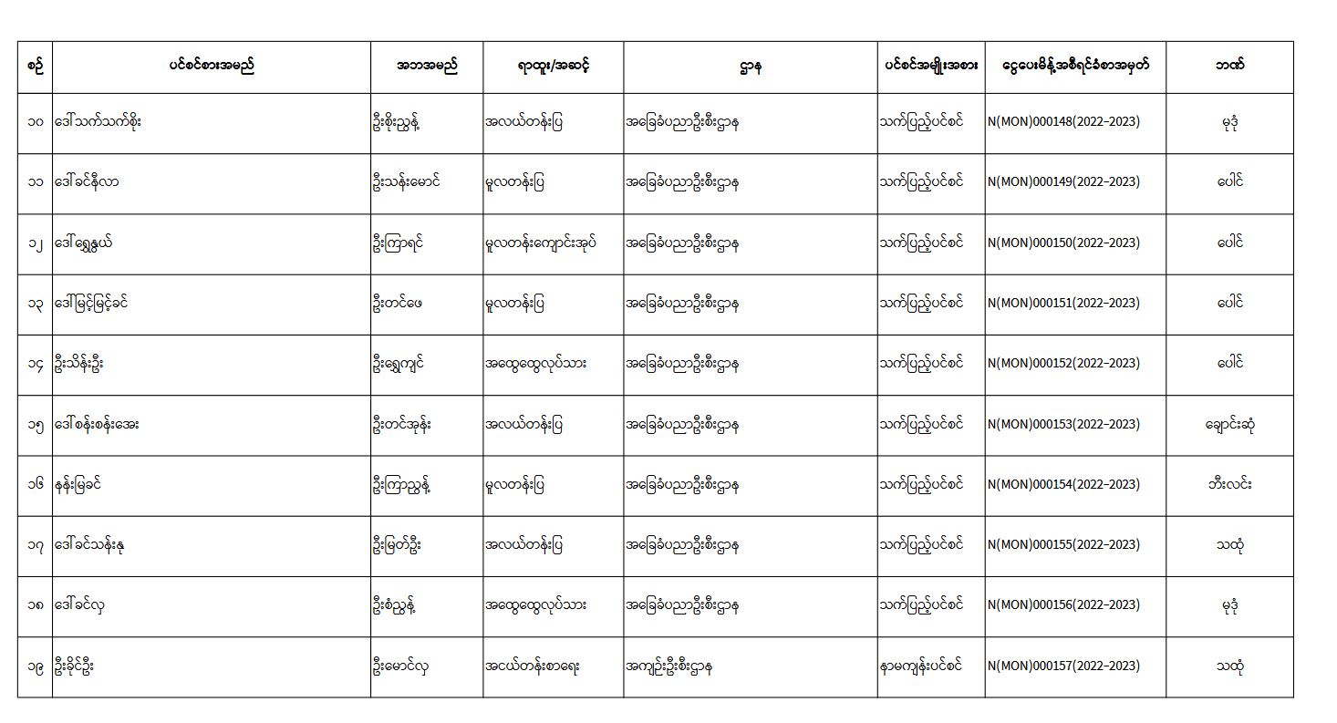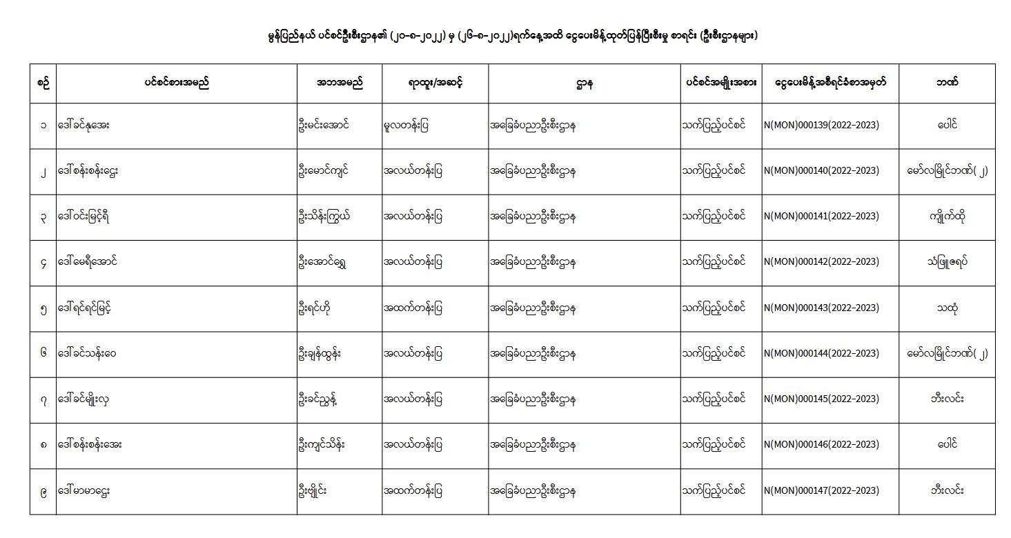 ပင်စင်ဦးစီးဌာန၊ မွန်ပြည်နယ်ဦးစီးမှူးရုံး၏ ငွေပေးမိန့်ထုတ်ပြန်မှုစာရင်း (၂၀-၈-၂၀၂၂ မှ ၂၆-၈-၂၀၂၂) pdfinance_editor Fri, 08/26/2022 - 15:27