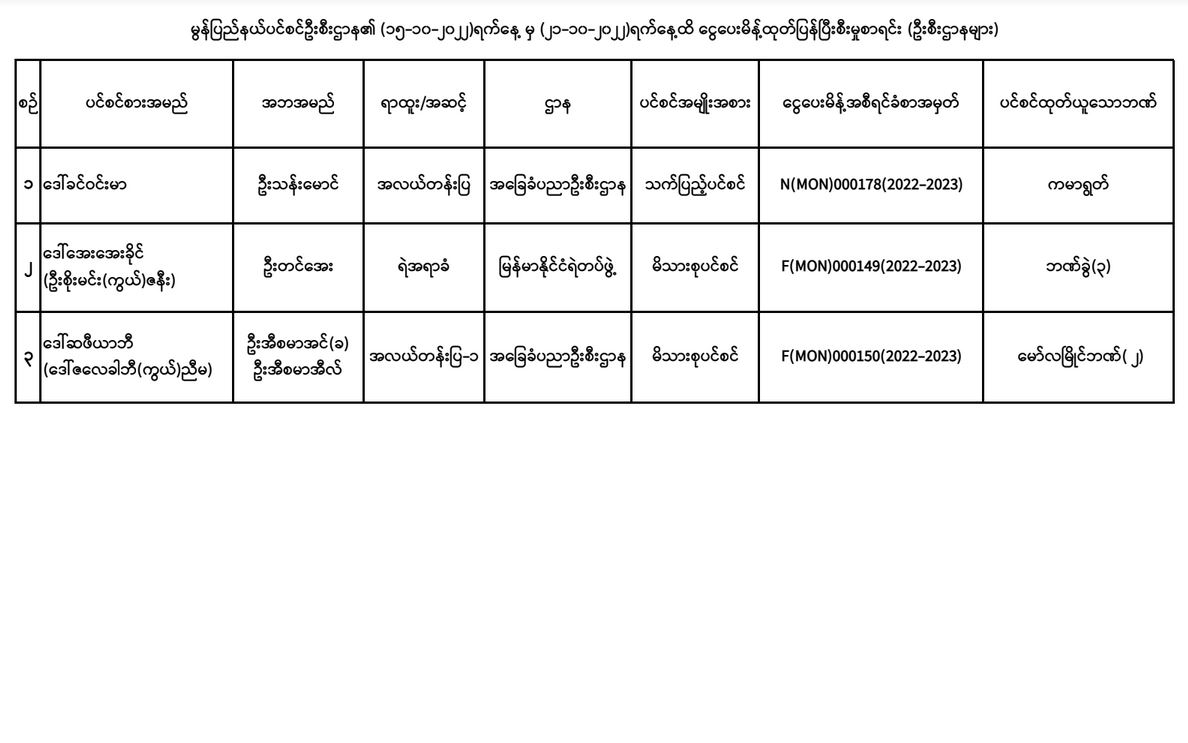 ပင်စင်ဦးစီးဌာန၊ မွန်ပြည်နယ်ဦးစီးမှူးရုံး၏ ငွေပေးမိန့်ထုတ်ပြန်မှုစာရင်း (၁၅-၁၀-၂၀၂၂ မှ ၂၁-၁၀-၂၀၂၂)