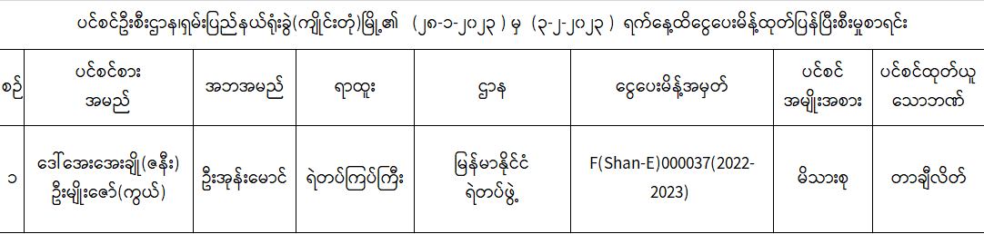 ပင်စင်ဦးစီးဌာန၊ရှမ်းပြည်နယ်(ကျိုင်းတုံ)မြို့၏ငွေပေးမိန့်ထုတ်ပြန်မှုစာရင်း(၂၈-၁-၂၀၂၃ မှ ၂-၃-၂၀၂၃) pdfinance_editor Fri, 02/03/2023 - 12:49