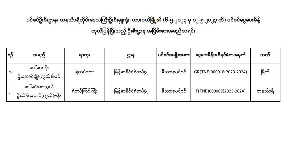 ပင်စင်ဦးစီးဌာန၊ တနင်္သာရီတိုင်းဒေသကြီးဦးစီးမှူးရုံး၏ ငွေပေးမိန့်ထုတ်ပြန်မှုစာရင်း (၆-၅-၂၀၂၃ မှ ၁၂-၅-၂၀၂၃)