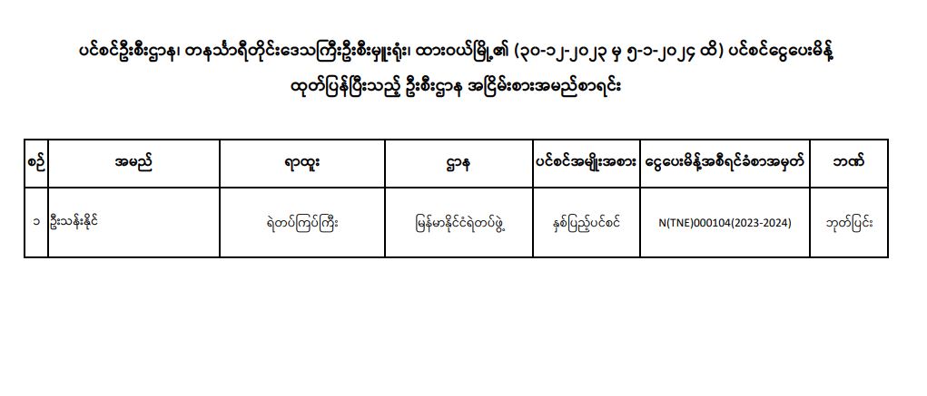 ပင်စင်ဦးစီးဌာန၊ တနင်္သာရီတိုင်းဒေသကြီးဦးစီးမှူးရုံး၏ ငွေပေးမိန့်ထုတ်ပြန်မှုစာရင်း (၃၀-၁၂-၂၀၂၃ မှ ၅-၁-၂၀၂၄)
