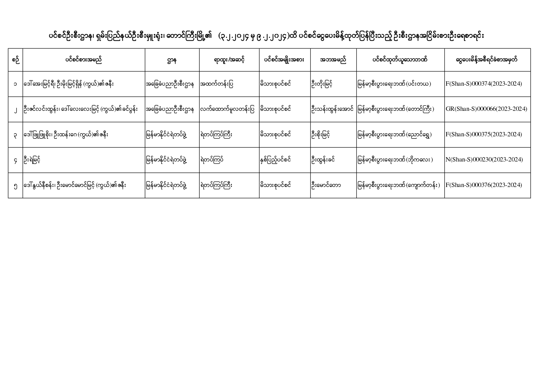 ပင်စင်ဦးစီးဌာန၊ ရှမ်းပြည်နယ်ဦးစီးမှူးရုံး၏ ငွေပေးမိန့်ထုတ်ပြန်မှုစာရင်း (၃-၂-၂၀၂၄ မှ ၉-၂-၂၀၂၄) pdfinance_editor Fri, 02/09/2024 - 13:42